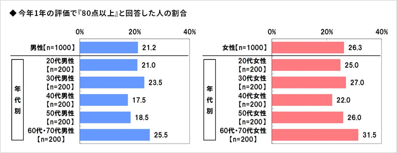 『80点以上』と回答した人の割合をみると、男性と比べて女性のほうが軒並み高くなりました。最も高くなったのは60代・70代女性(31.5%)、最も低くなったのは40代男性(17.5%)でした。