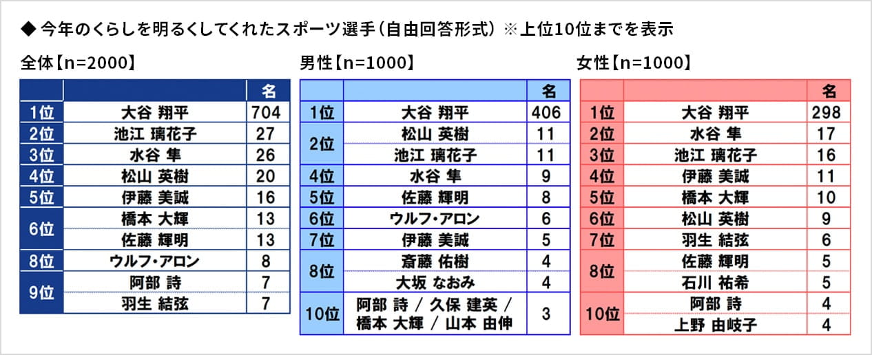 【スポーツ選手】では「大谷 翔平さん」がダントツとなり、2位「池江 璃花子さん」、3位「水谷 隼さん」、4位「松山 英樹さん」、5位「伊藤 美誠さん」となりました。