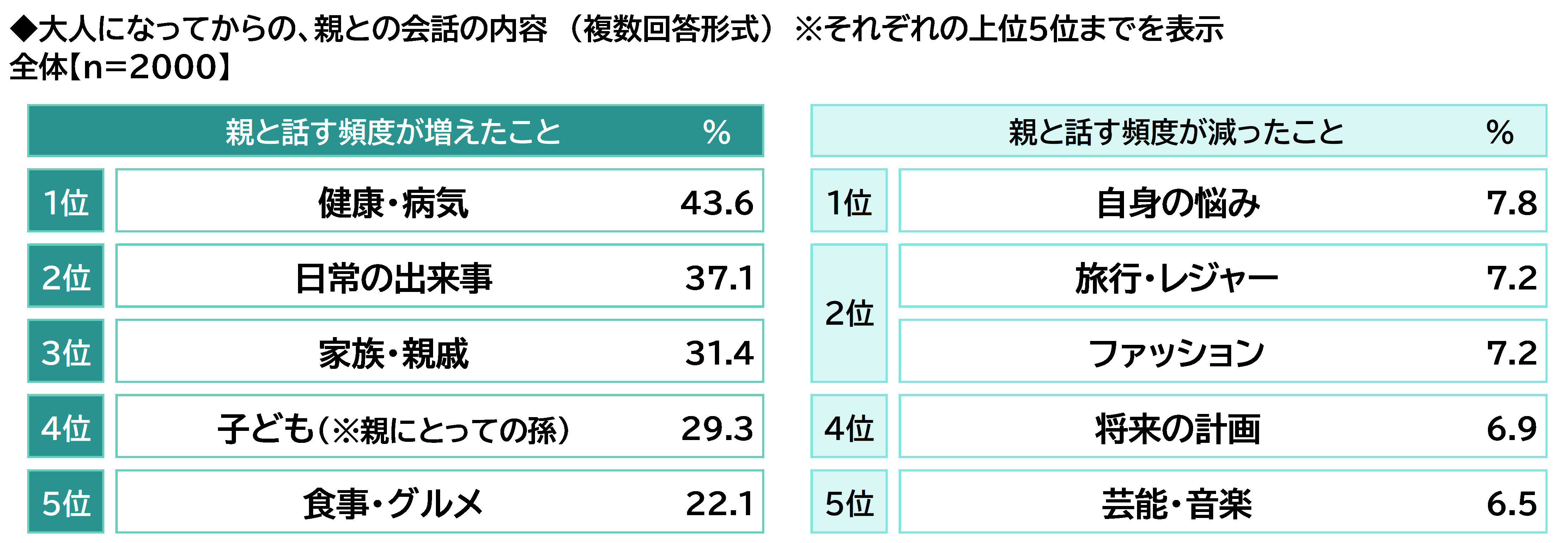 大人になってから親と話す頻度が増えたこと 1位「健康・病気」2位「日常の出来事」3位「家族・親戚」
