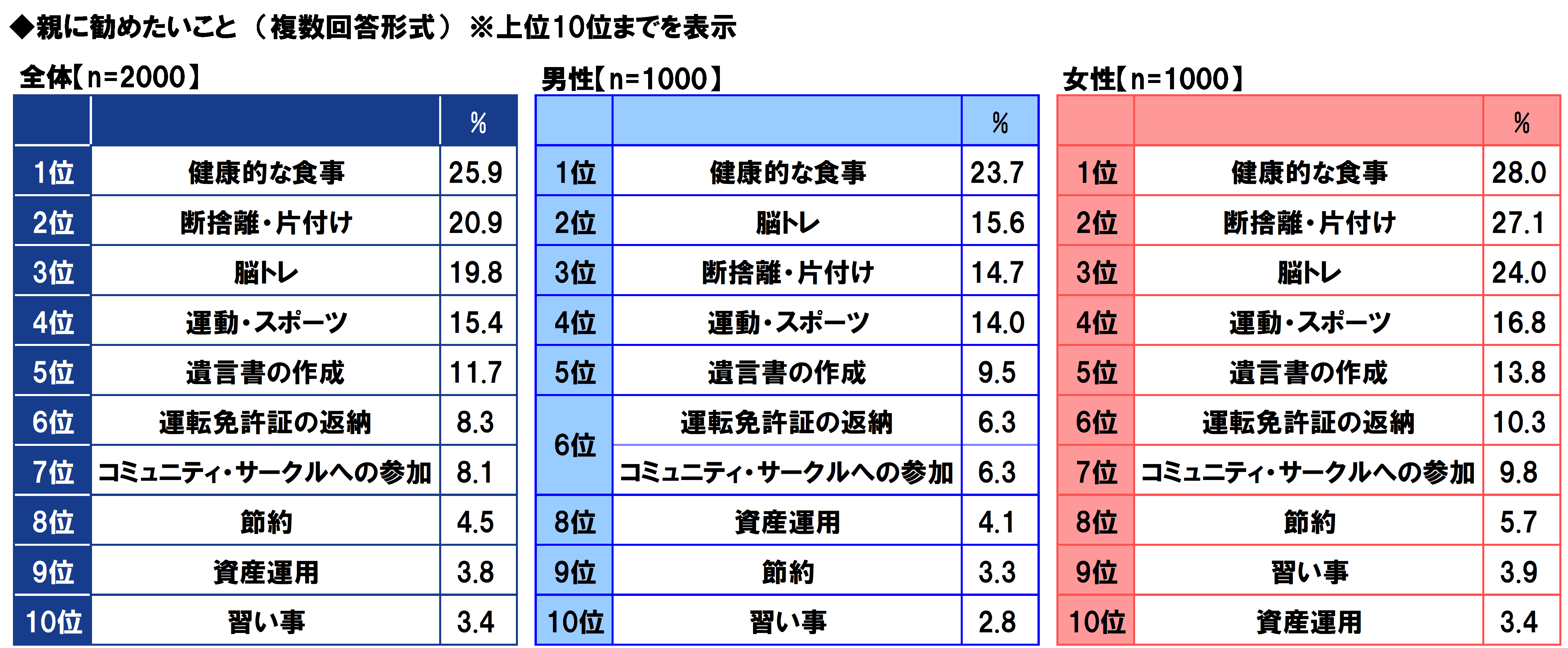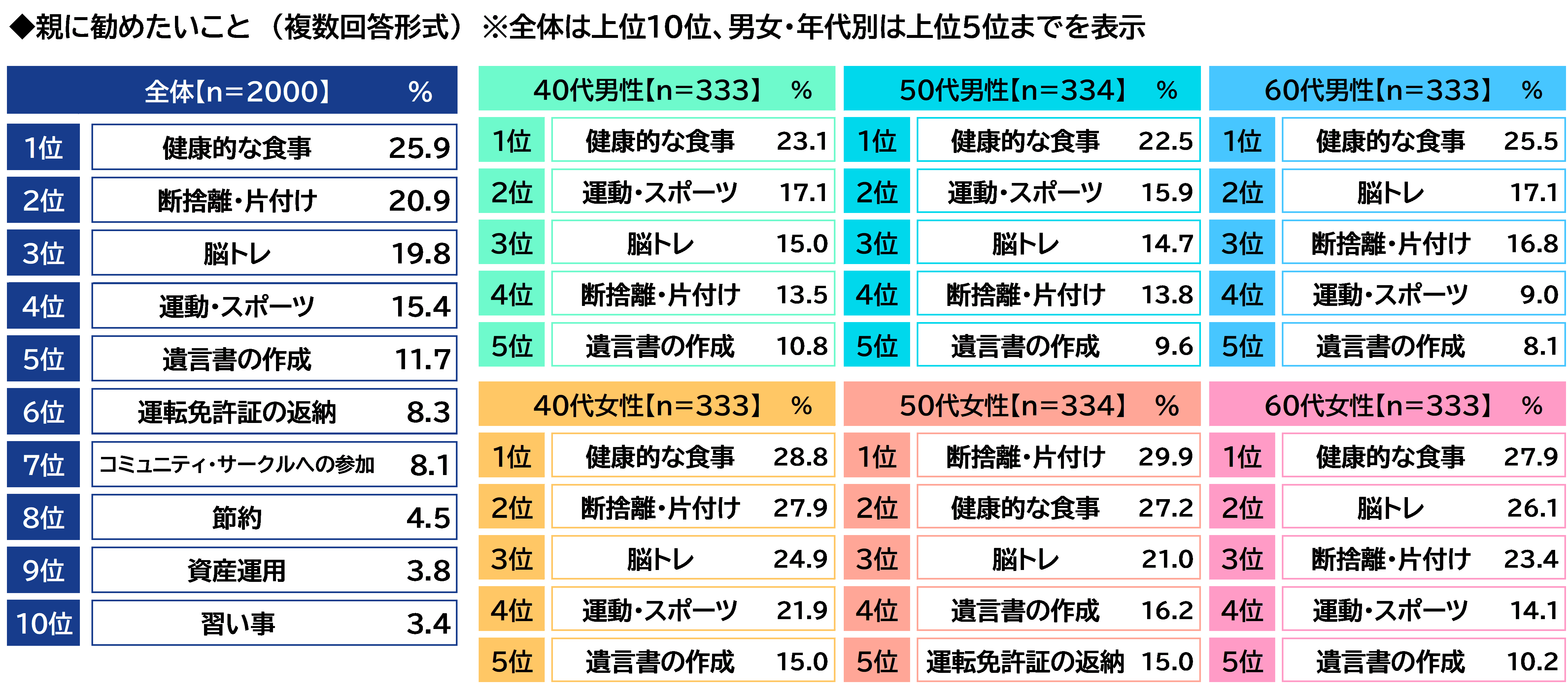 親に勧めたいこと 1位「健康的な食事」2位「断捨離・片付け」3位「脳トレ」