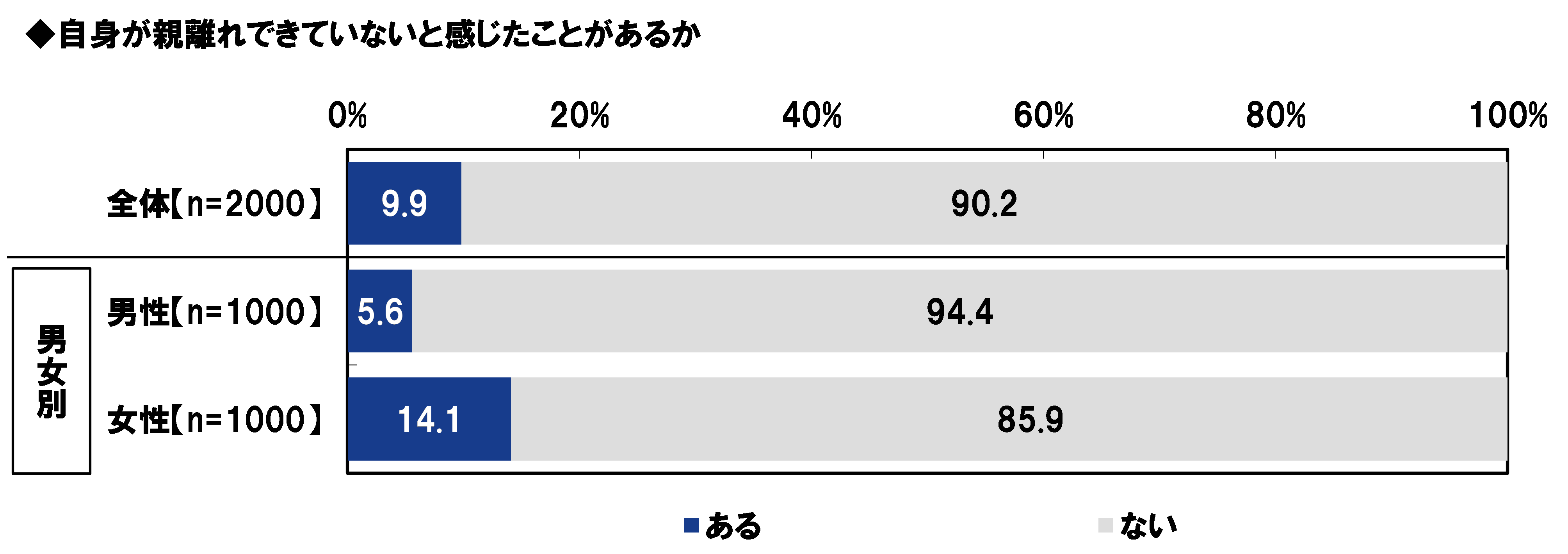 まず、全回答者(2,000名)に、自身が親離れできていないと感じたことがあるかを聞いたところ、「ある」は9.9%、「ない」は90.2%と、ほとんどが親離れできていると感じていることがわかりました。