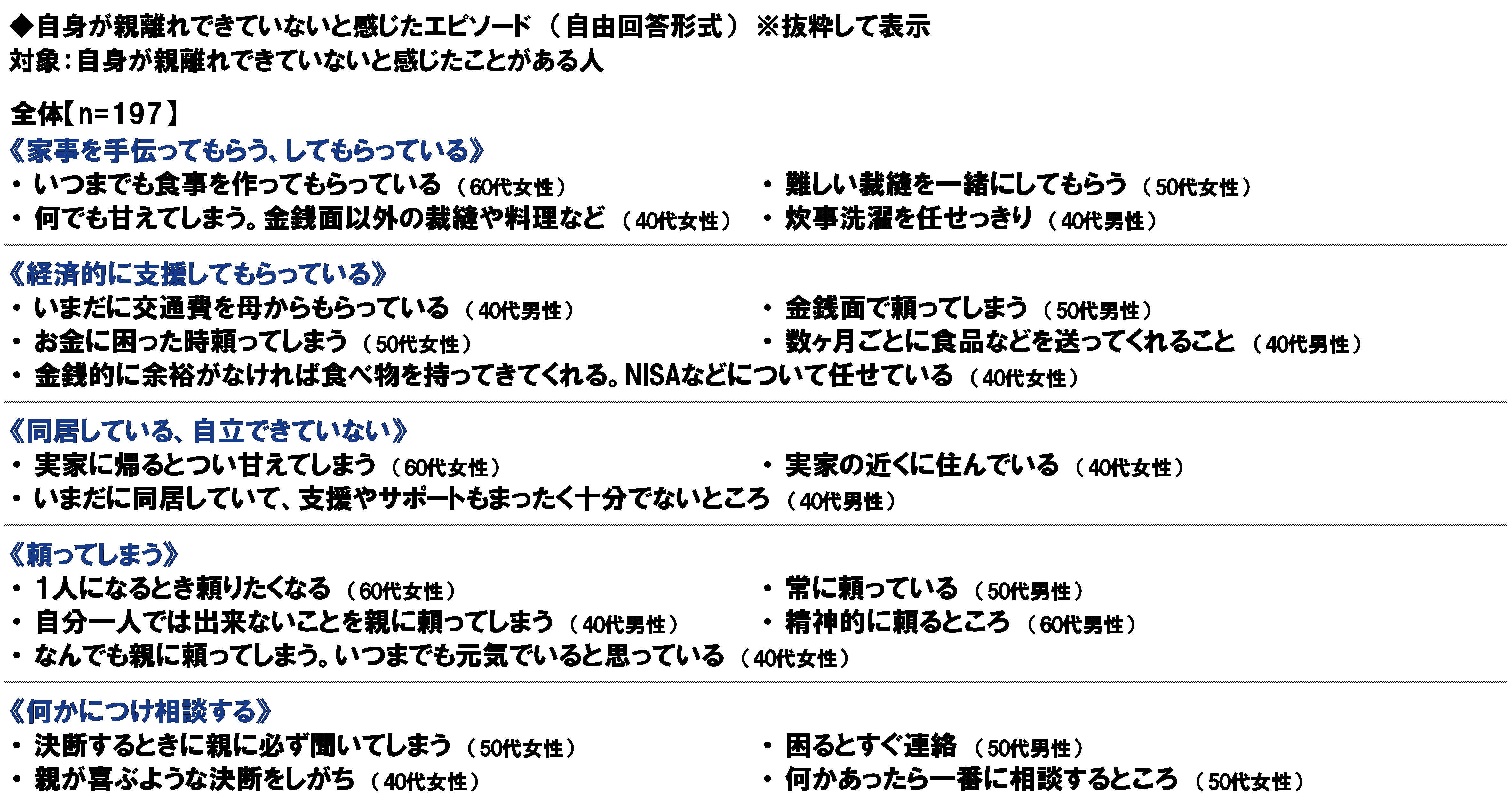 自身が親離れできていないと感じたことがある人(197名)に、自身が親離れできていないと感じたエピソードを聞いたところ、「いつまでも食事を作ってもらっている(60代女性)」、「数ヶ月ごとに食品などを送ってくれること(40代男性)」、「実家の近くに住んでいる(40代女性)」といった回答がみられました。また、「なんでも親に頼ってしまう。いつまでも元気でいると思っている(40代女性)」や「困るとすぐ連絡(50代男性)」、「親が喜ぶような決断をしがち(40代女性)」といった回答もみられました。経済的な援助のほか、家事の手伝いといった親からの支援やサポートを受けるときや精神的に親に頼ってしまうときに、自身が親離れできていないと実感することが多いようです。