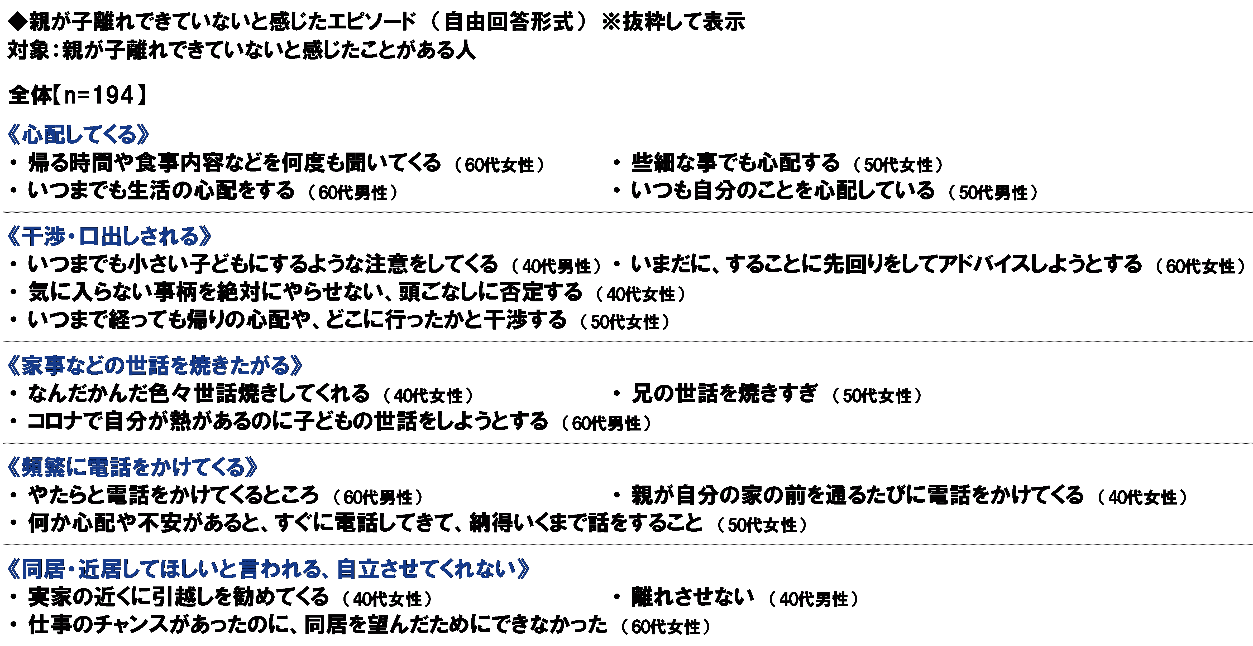 親が子離れできていないと感じたことがある人(194名)に、親が子離れできていないと感じたエピソードを聞いたところ、「帰る時間や食事内容などを何度も聞いてくる(60代女性)」や「いつまでも小さい子どもにするような注意をしてくる(40代男性)」といった回答、「コロナで自分が熱があるのに子どもの世話をしようとする(60代男性)」、「親が自分の家の前を通るたびに電話をかけてくる(40代女性)」、「実家の近くに引越しを勧めてくる(40代女性)」、「仕事のチャンスがあったのに、同居を望んだためにできなかった(60代女性)」といった回答がみられました。親が子離れできていないと感じている人では、些細なことで心配されたり、干渉・心配されるといったいつまでも子どものような扱いをされたりすることが多いようです。