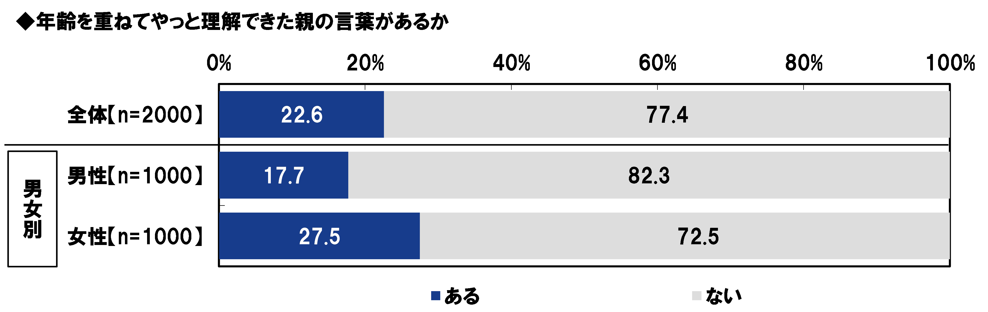 全回答者(2,000名)に、年齢を重ねてやっと理解できた親の言葉があるかを聞いたところ、「ある」は22.6%、「ない」は77.4%でした。
