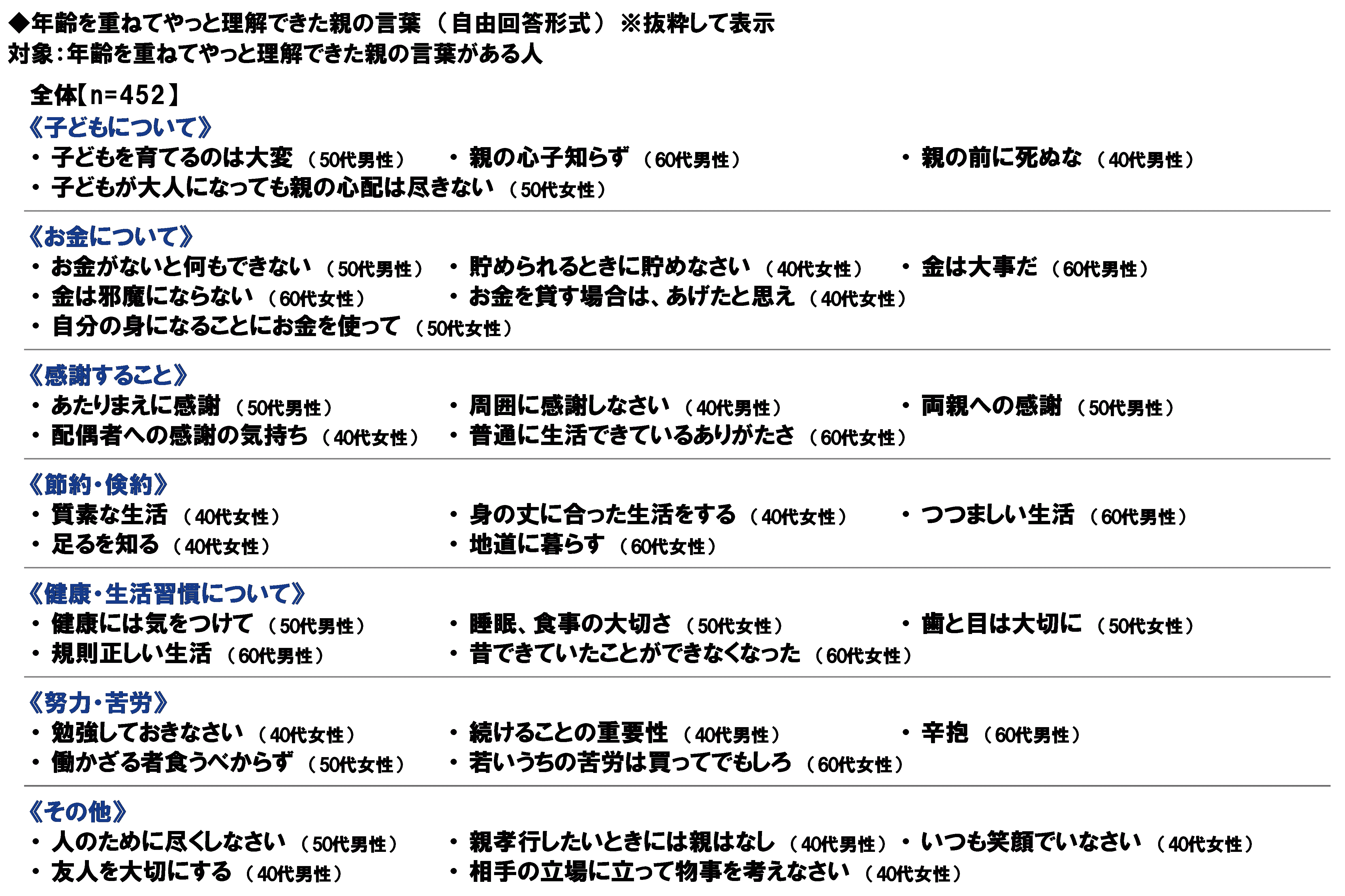 年齢を重ねてやっと理解できた親の言葉がある人(452名)に、年齢を重ねてやっと理解できた親の言葉を聞いたところ、「親の心子知らず(60代男性)」、「お金を貸す場合は、あげたと思え(40代女性)」、「普通に生活できているありがたさ(60代女性)」といった回答や、「身の丈に合った生活をする(40代女性)」、「睡眠、食事の大切さ(50代女性)」、「勉強しておきなさい(40代女性)」、「人のために尽くしなさい(50代男性)」、「親孝行したいときには親はなし(40代男性)」といった言葉が挙げられました。