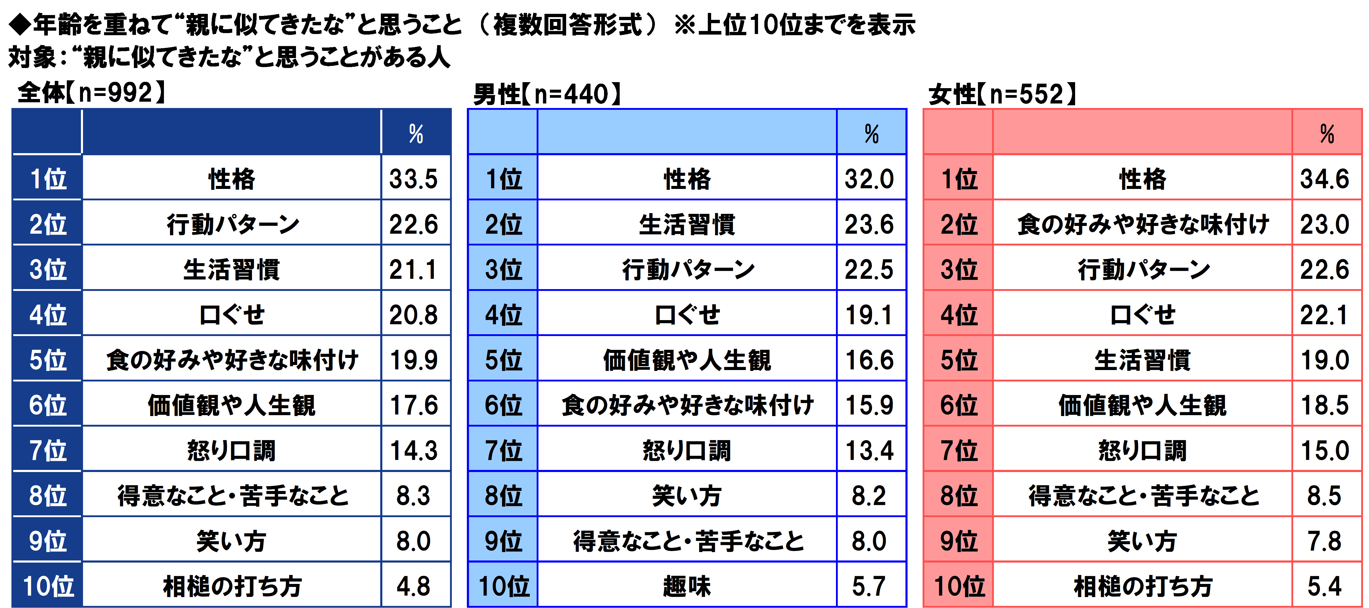 “親に似てきたな”と思うことがある人(992名)に、年齢を重ねて“親に似てきたな”と思うことを聞いたところ、1位「性格」(33.5%)、2位「行動パターン」(22.6%)、3位「生活習慣」(21.1%)となりました。普段の言動から似てきたことを実感することが多いのではないでしょうか。次いで、4位「口ぐせ」(20.8%)、5位「食の好みや好きな味付け」(19.9%)となりました。