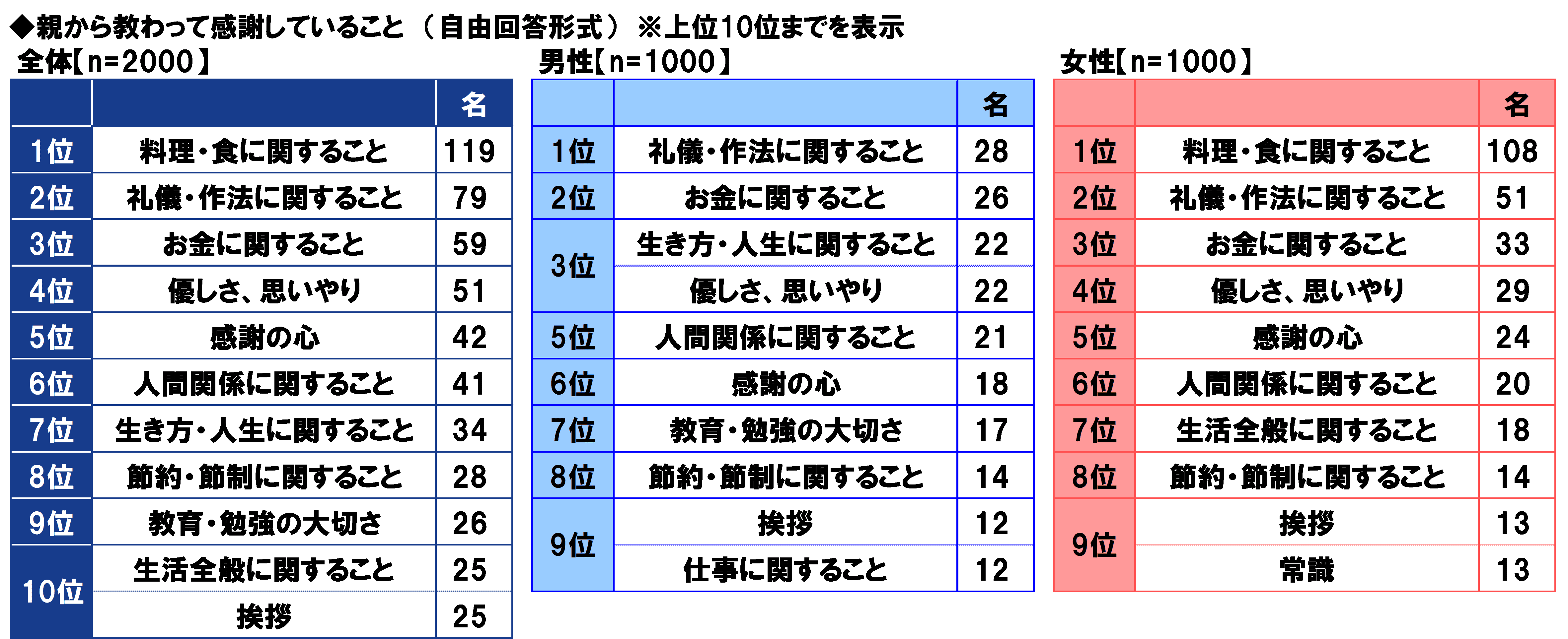 男女別にみると、男性では1位「礼儀・作法に関すること」、2位「お金に関すること」、3位「生き方・人生に関すること」「優しさ、思いやり」となり、女性では1位「料理・食に関すること」、2位「礼儀・作法に関すること」、3位「お金に関すること」、4位「優しさ、思いやり」、5位「感謝の心」でした。「料理・食に関すること」は、女性ではダントツとなった一方、男性ではTOP10にランクインしませんでした。