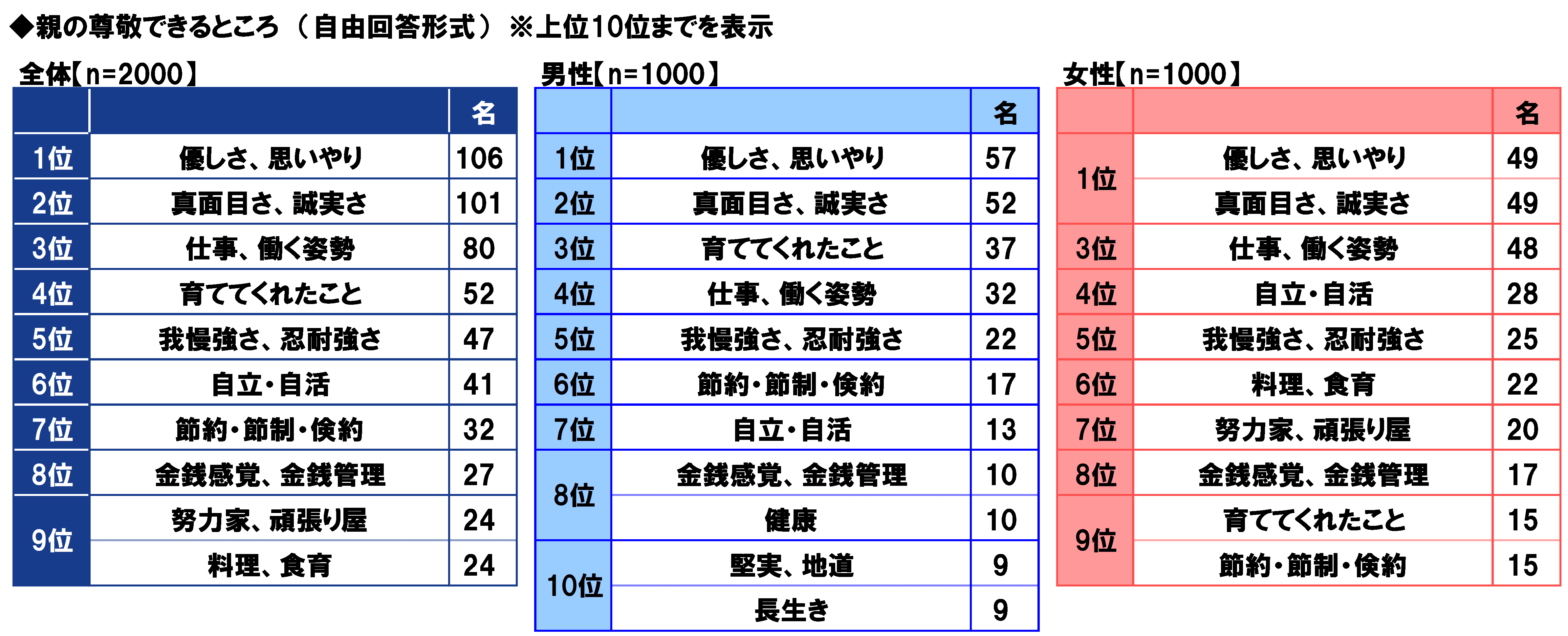 男女別にみると、男女ともに「優しさ、思いやり」が1位となり、男性では2位「真面目さ、誠実さ」、3位「育ててくれたこと」、4位「仕事、働く姿勢」、5位「我慢強さ、忍耐強さ」、女性では「優しさ、思いやり」と同数で「真面目さ、誠実さ」も1位となり、3位「仕事、働く姿勢」、4位「自立・自活」、5位「我慢強さ、忍耐強さ」となりました。また、女性では「料理、食育」が6位に挙がりました。