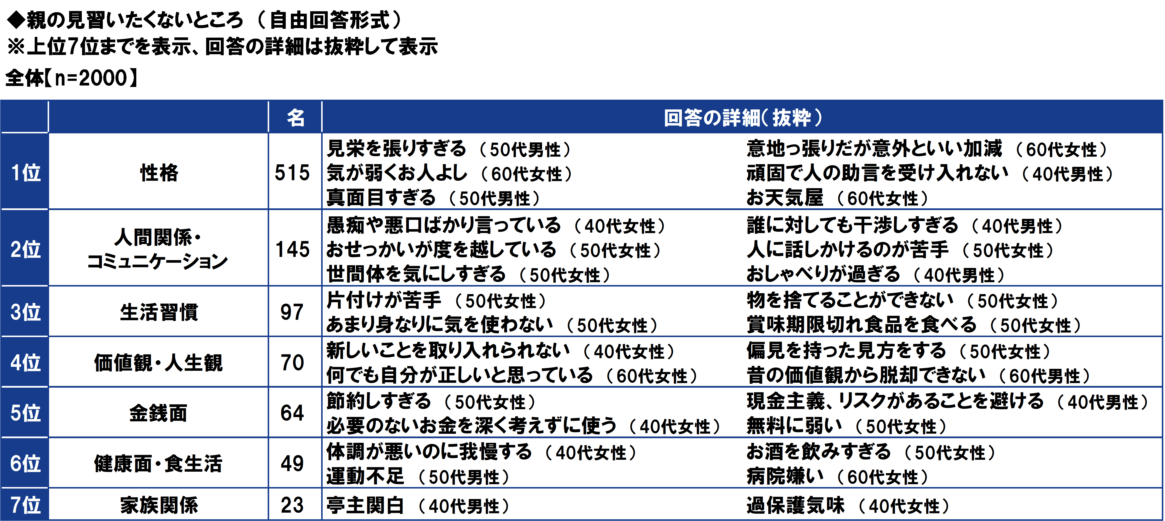 回答の詳細をみると、1位の「性格」では「見栄を張りすぎる(50代男性)」、「意地っ張りだが意外といい加減(60代女性)」、「頑固で人の助言を受け入れない(40代男性)」、2位の「人間関係・コミュニケーション」では「おせっかいが度を越している(50代女性)」、「世間体を気にしすぎる(50代女性)」、3位の「生活習慣」では「物を捨てることができない(50代女性)」、「あまり身なりに気を使わない(50代女性)」といった回答が挙げられました。