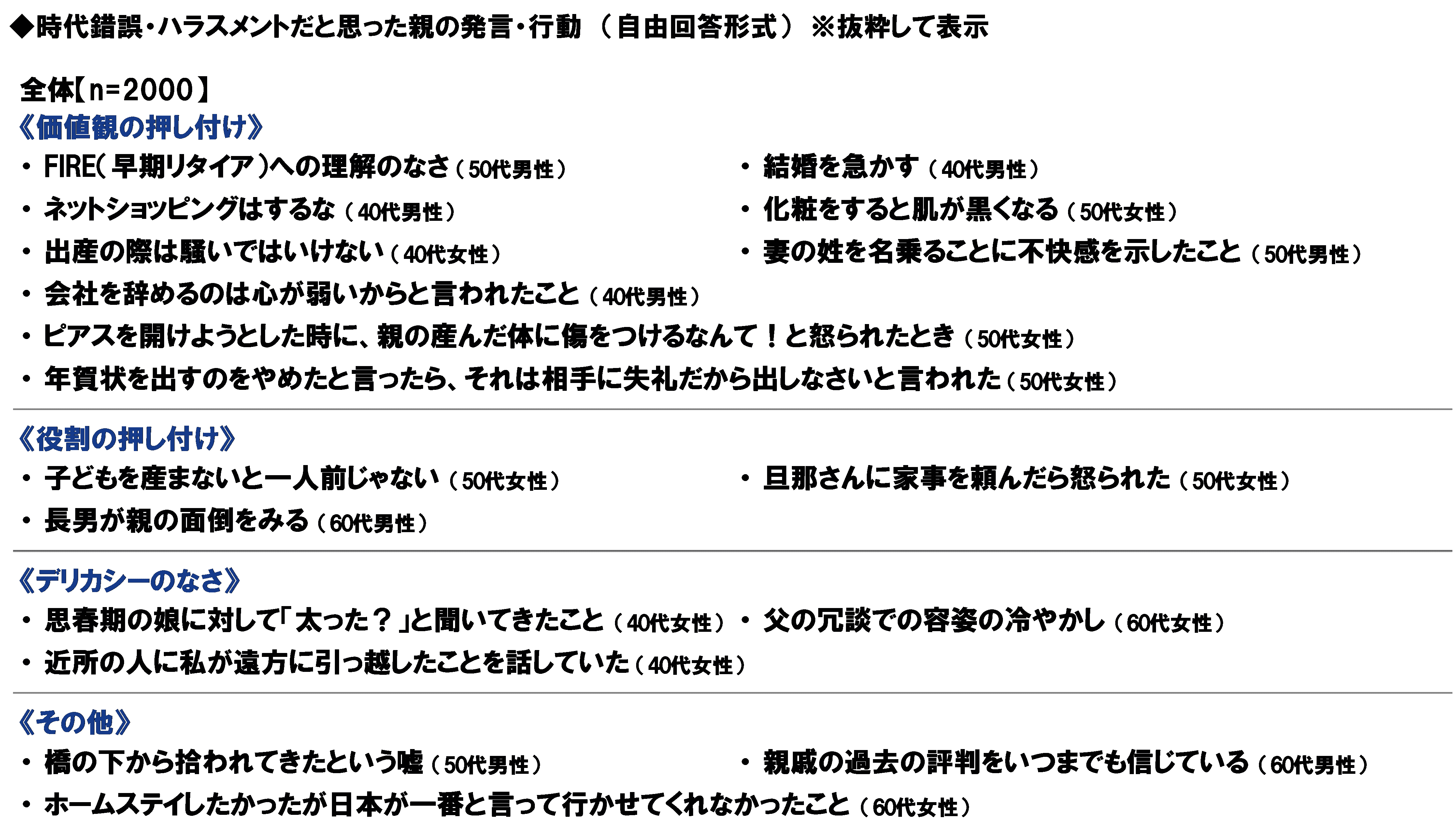 全回答者(2,000名)に、時代錯誤・ハラスメントだと思った親の発言・行動を聞いたところ、「妻の姓を名乗ることに不快感を示したこと(50代男性)」、「会社を辞めるのは心が弱いからと言われたこと(40代男性)」、「ピアスを開けようとした時に、親の産んだ体に傷をつけるなんて!と怒られたとき(50代女性)」といった価値観を押し付けるような言動が多くみられました。