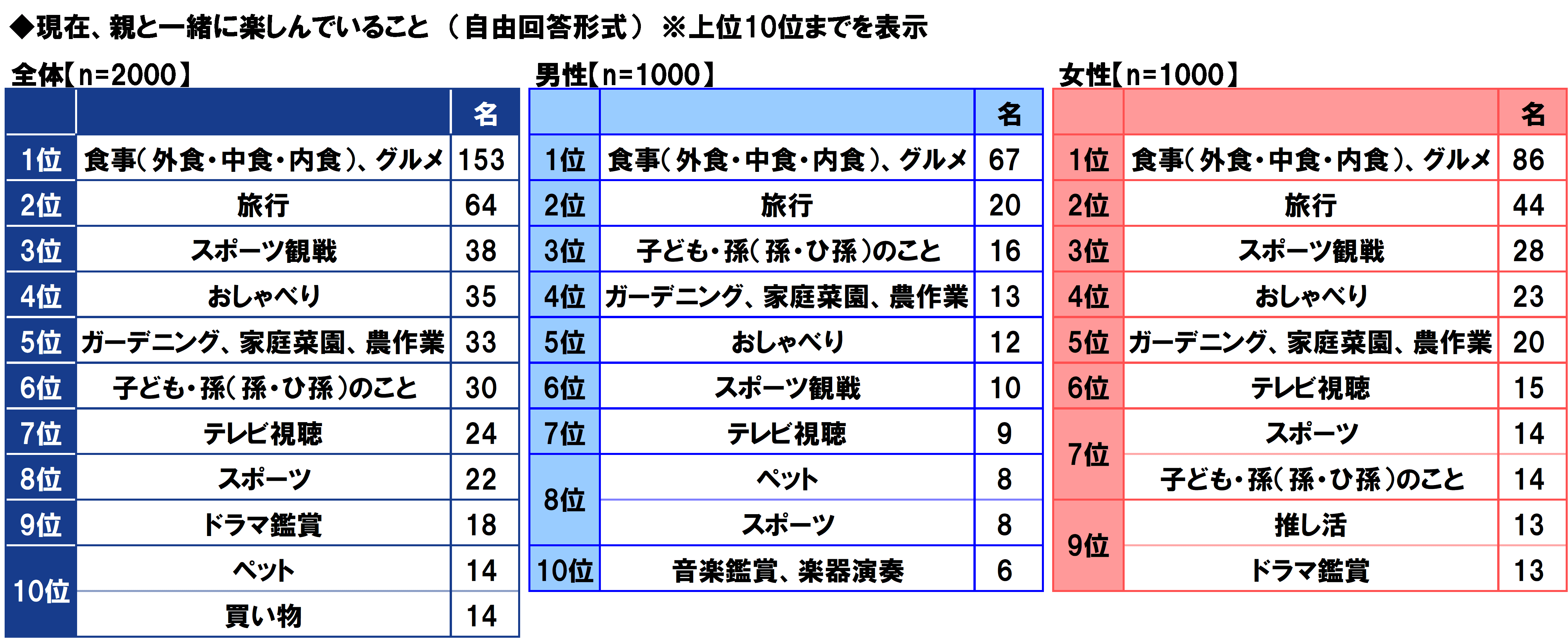 現在、親と一緒に楽しんでいること 1位「食事、グルメ」2位「旅行」3位「スポーツ観戦」