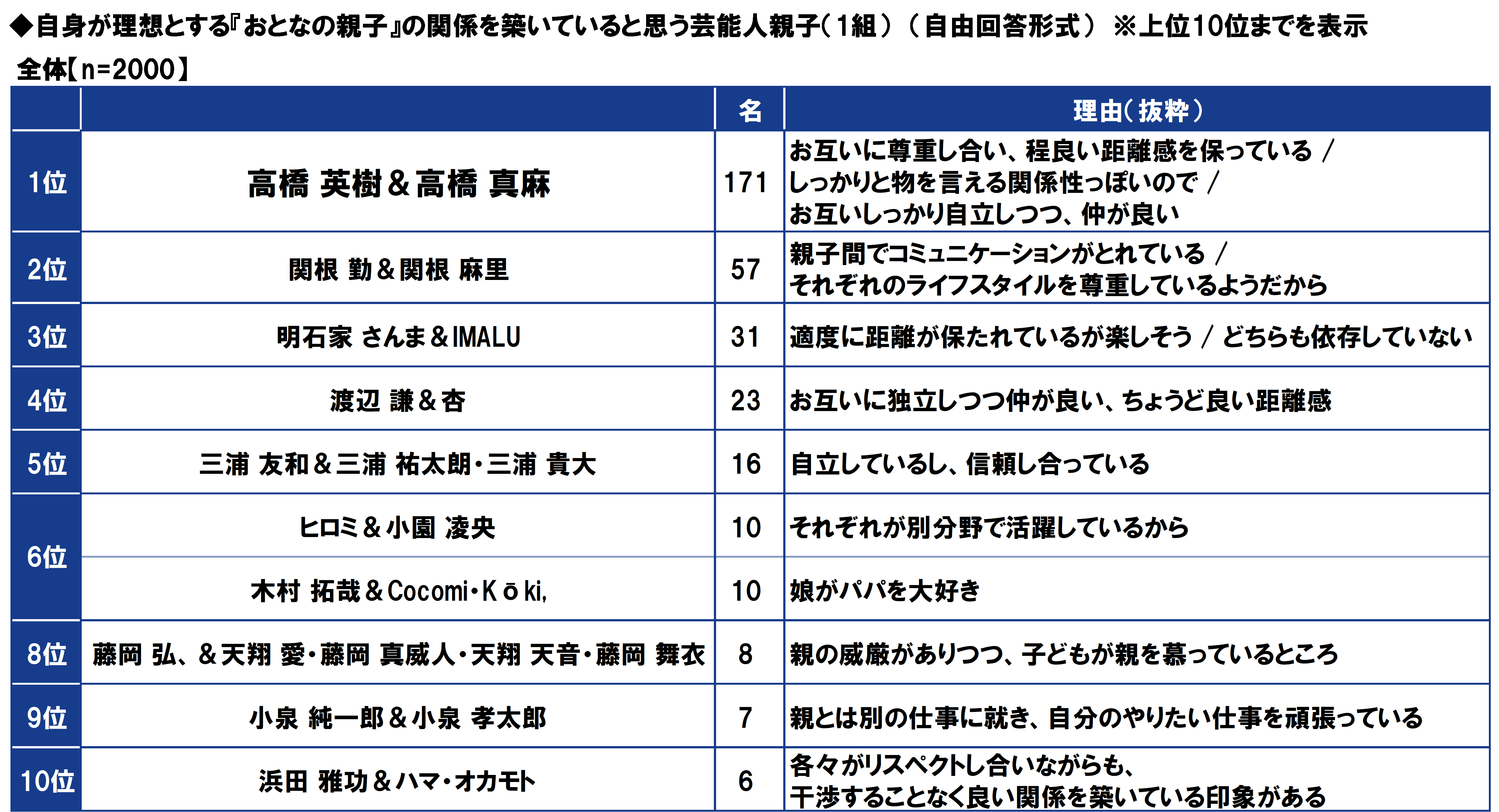 全回答者(2,000名)に、自身が理想とする『おとなの親子』の関係を築いていると思う芸能人親子(1組)を聞いたところ「高橋 英樹さん&高橋 真麻さん」が1位となり、次いで、2位「関根 勤さん&関根 麻里さん」、3位「明石家 さんまさん&IMALUさん」、4位「渡辺 謙さん&杏さん」、5位「三浦 友和さん&三浦 祐太朗さん・三浦 貴大さん」となりました。
