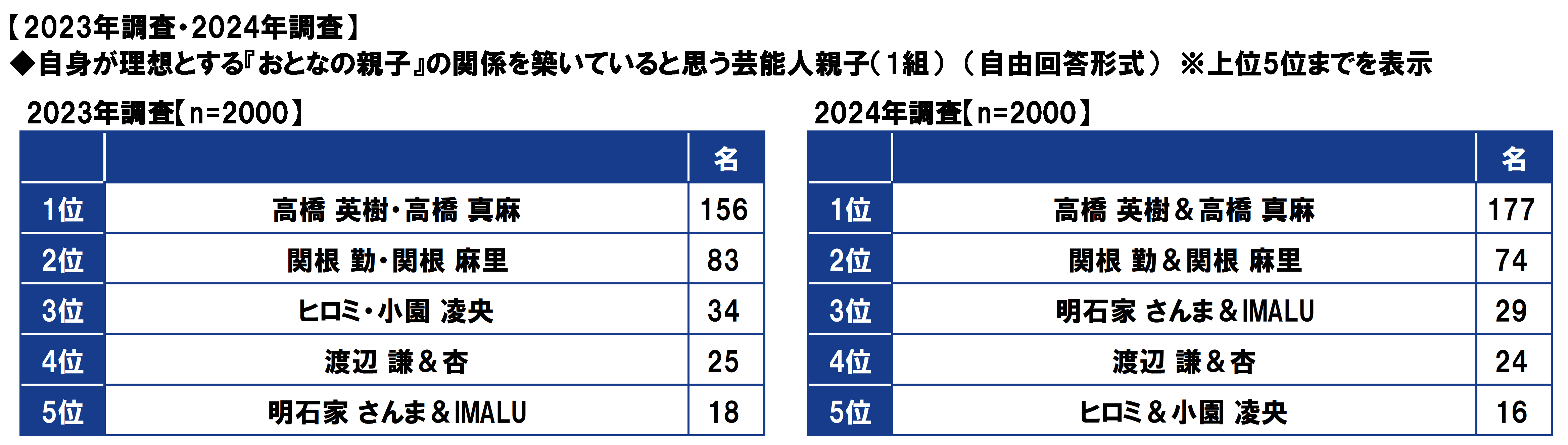 過去の調査結果とあわせてみると、3年連続で「高橋 英樹さん&高橋 真麻さん」が1位、「関根 勤さん&関根 麻里さん」が2位、「渡辺 謙さん&杏さん」が4位となり、2年連続で「明石家 さんまさん&IMALUさん」が3位でした。また、「小泉 純一郎さん&小泉 孝太郎さん」親子が初のTOP10入りとなりました。