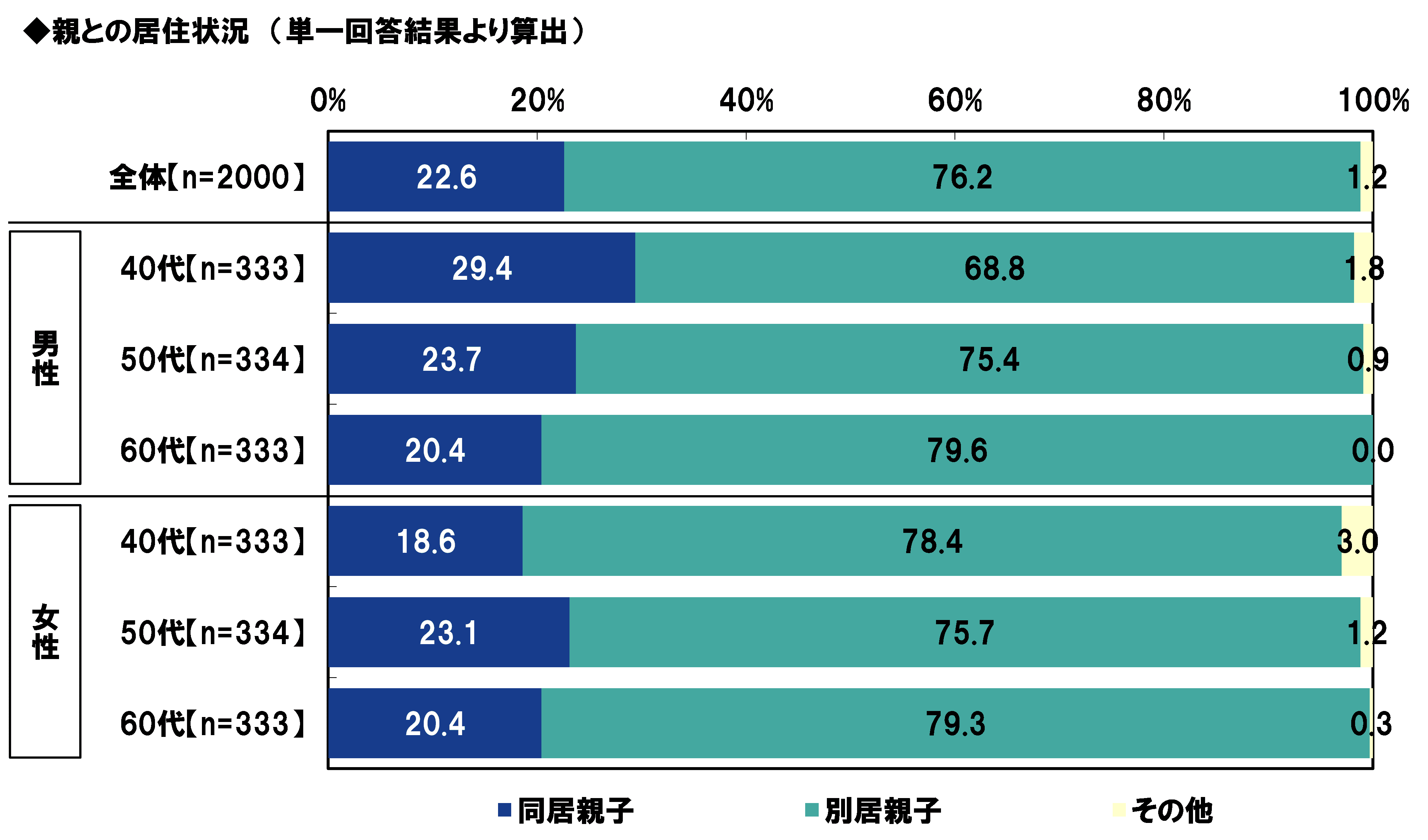 同居親子と別居親子を比較すると、「伝えている」(同居親子28.5%、別居親子14.4%)は同居親子が別居親子の約2倍となりました。同居親子では、生活を共にするうえで、資産の状況などについて情報を共有している親子が少なくないようです。