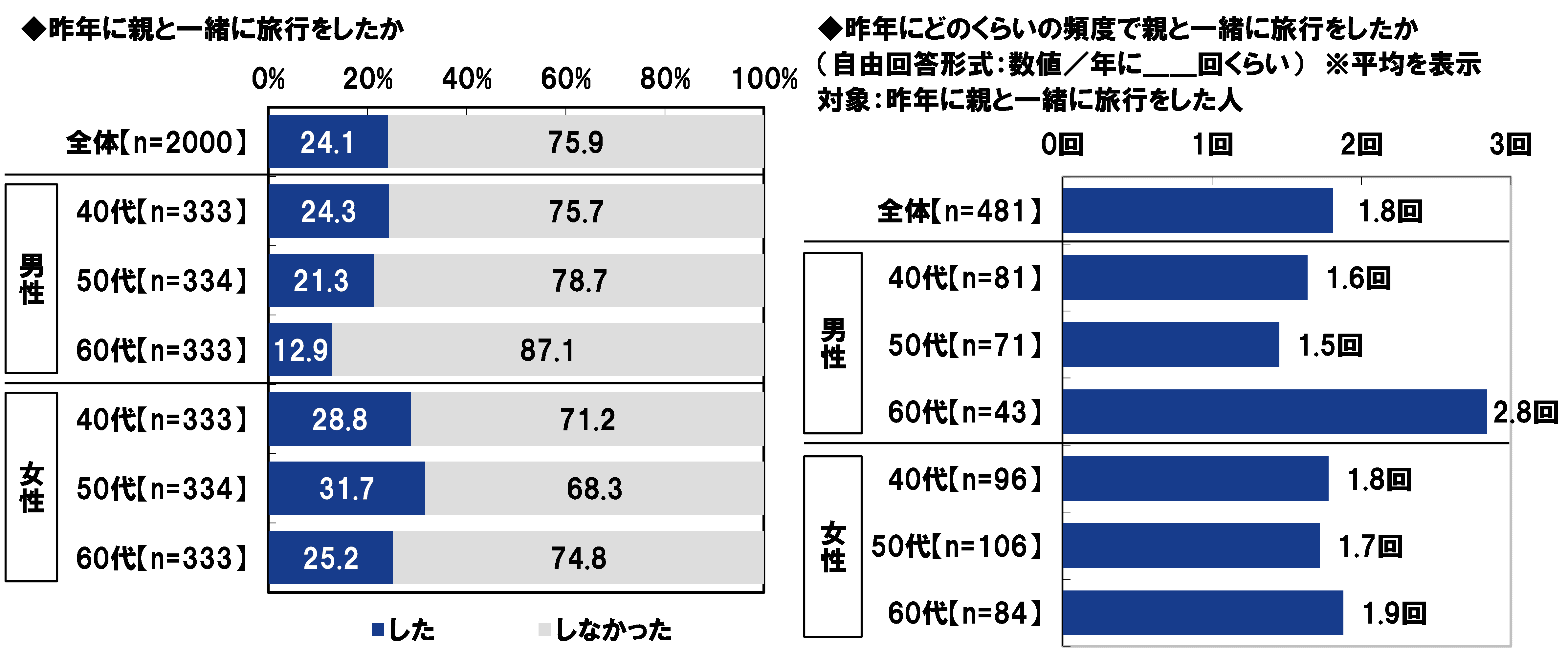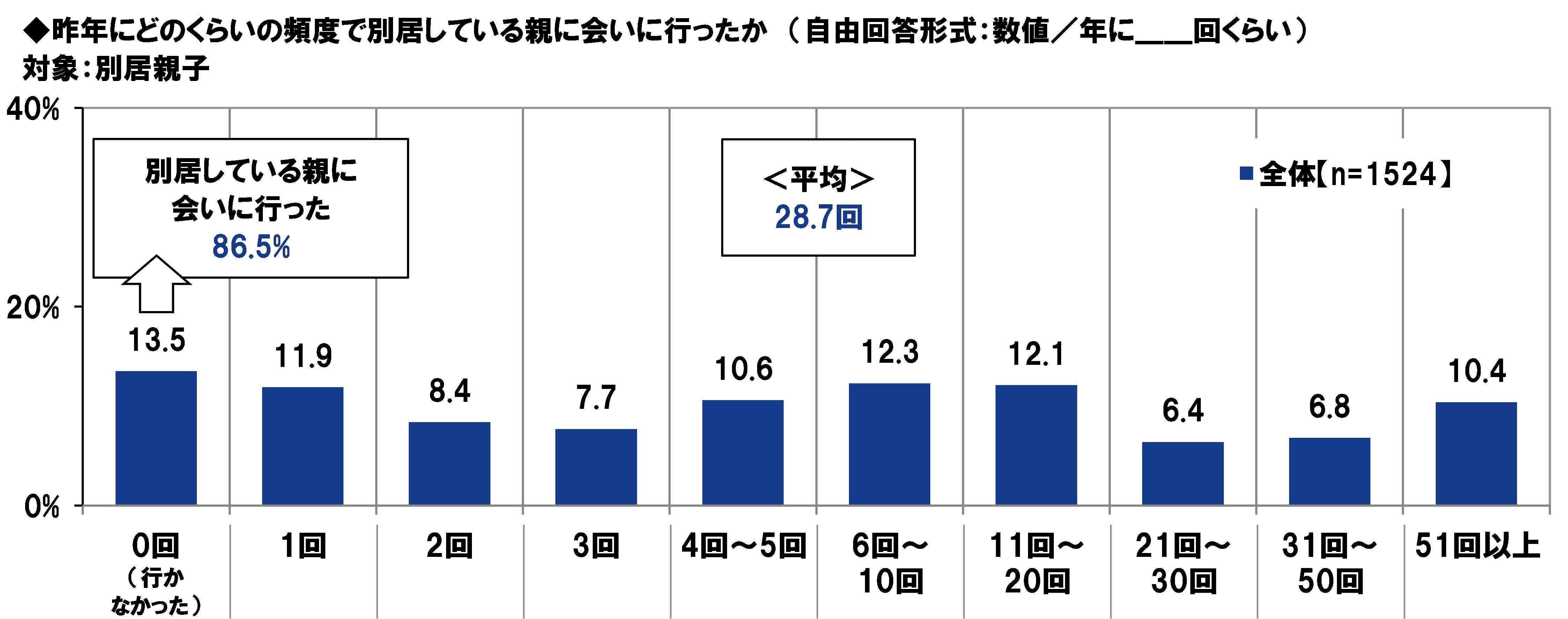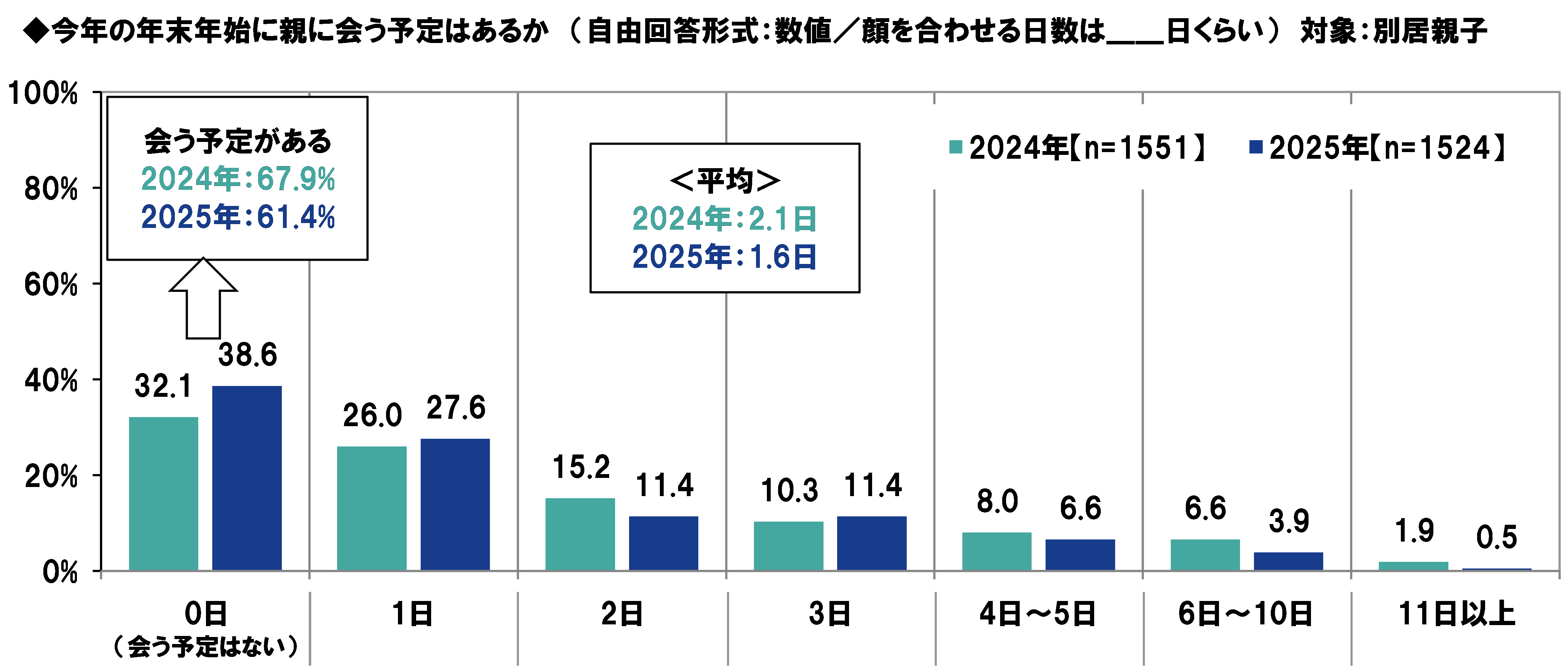 前回の調査結果と比較すると、会う予定がある人の割合(前回調査67.9%→今回調査61.4%)は6.5ポイント下降しました。コロナ禍は収束したものの、インバウンド需要や物価高を理由とする宿泊費の高騰などが離れて暮らすおとなの親子に影響しているのかもしれません。