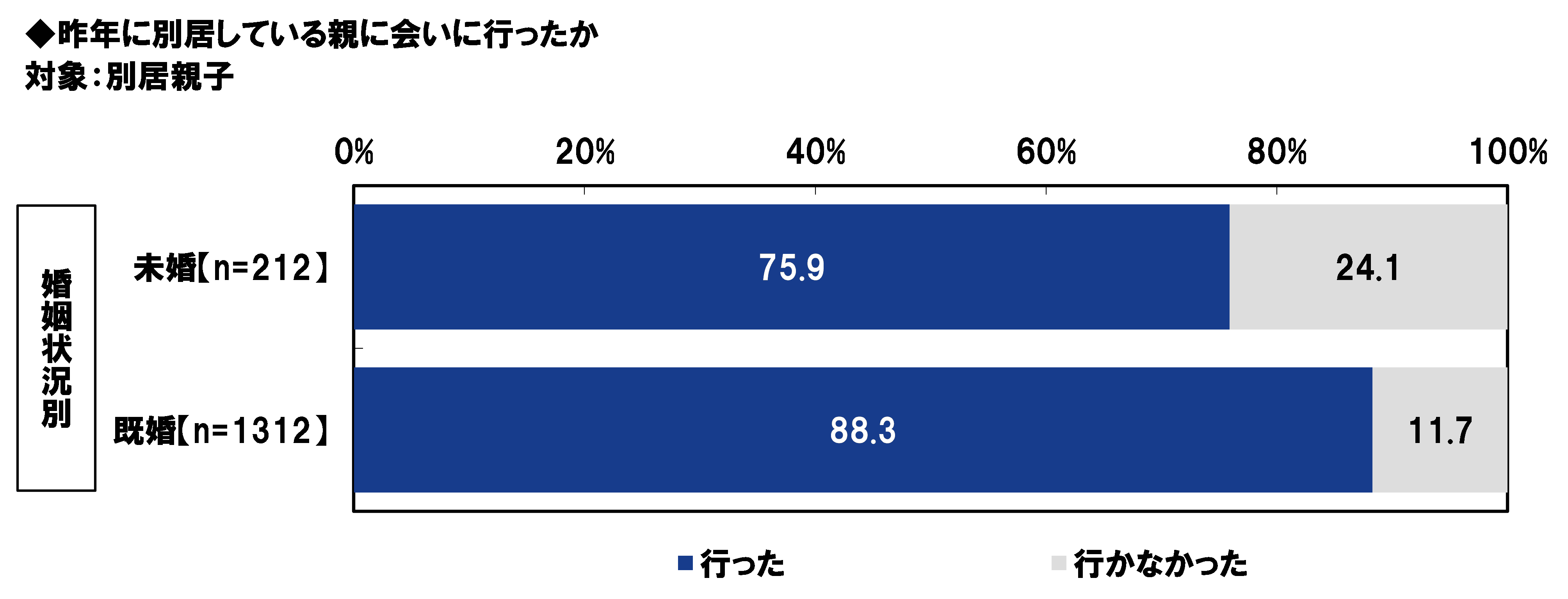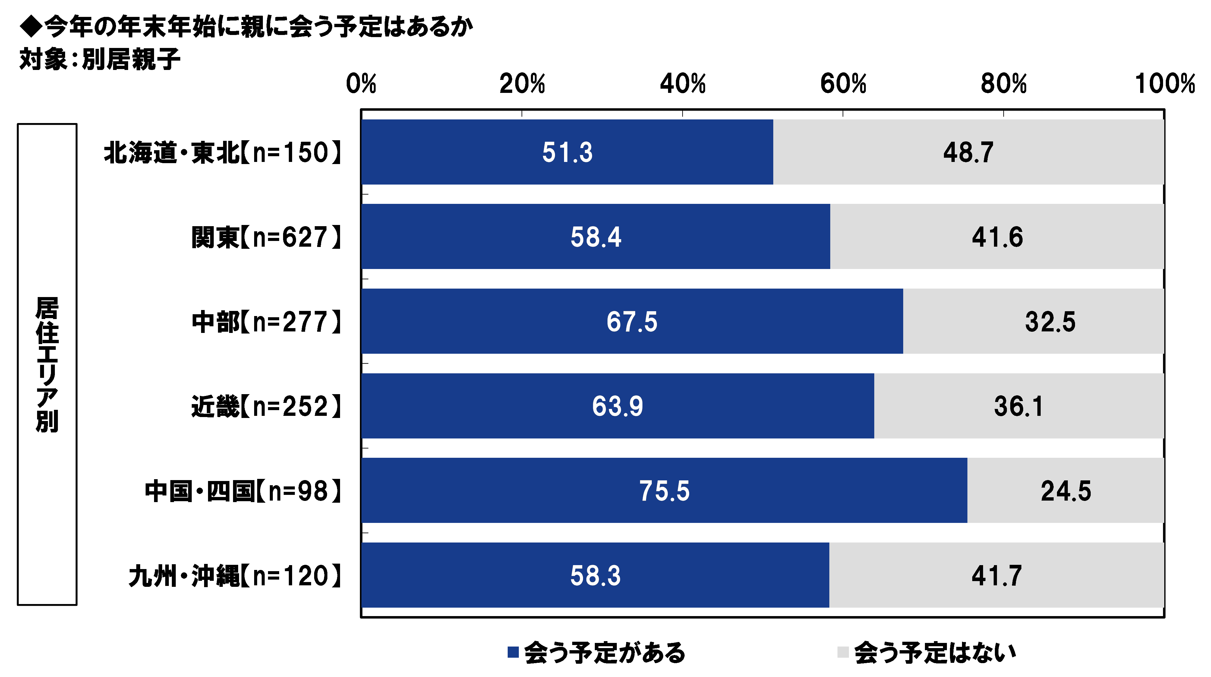 今年の年末年始に親に会う予定がある割合を居住エリア別にみると、最も高くなったのは中国・四国(75.5%)で7割半となりました。一方、北海道・東北(51.3%)、関東(58.4%)、九州・沖縄(58.3%)では50%台にとどまりました。