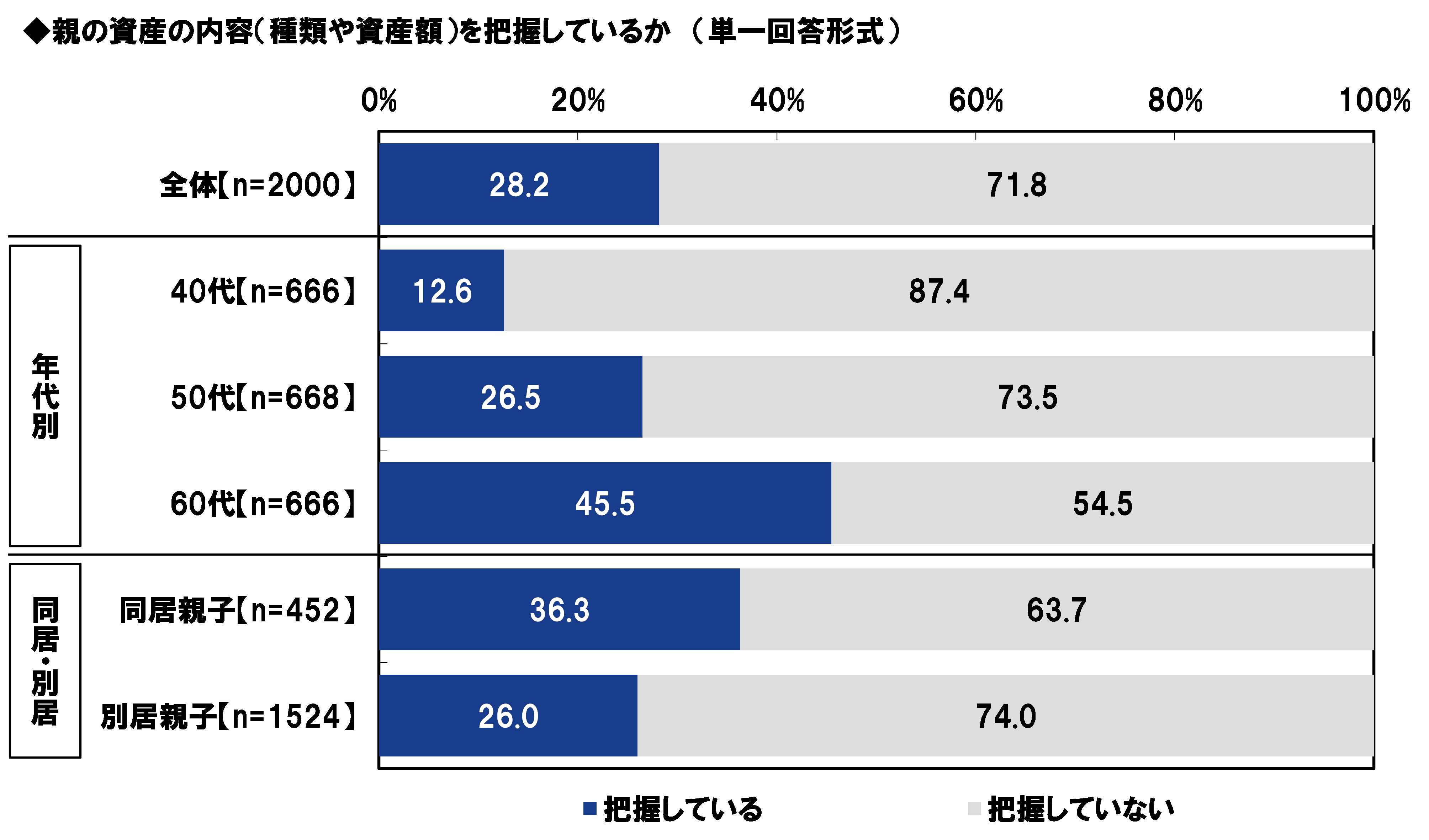 まず、親の資産の内容(種類や資産額)を把握しているか聞いたところ、「把握している」は28.2%、「把握していない」は71.8%となりました。