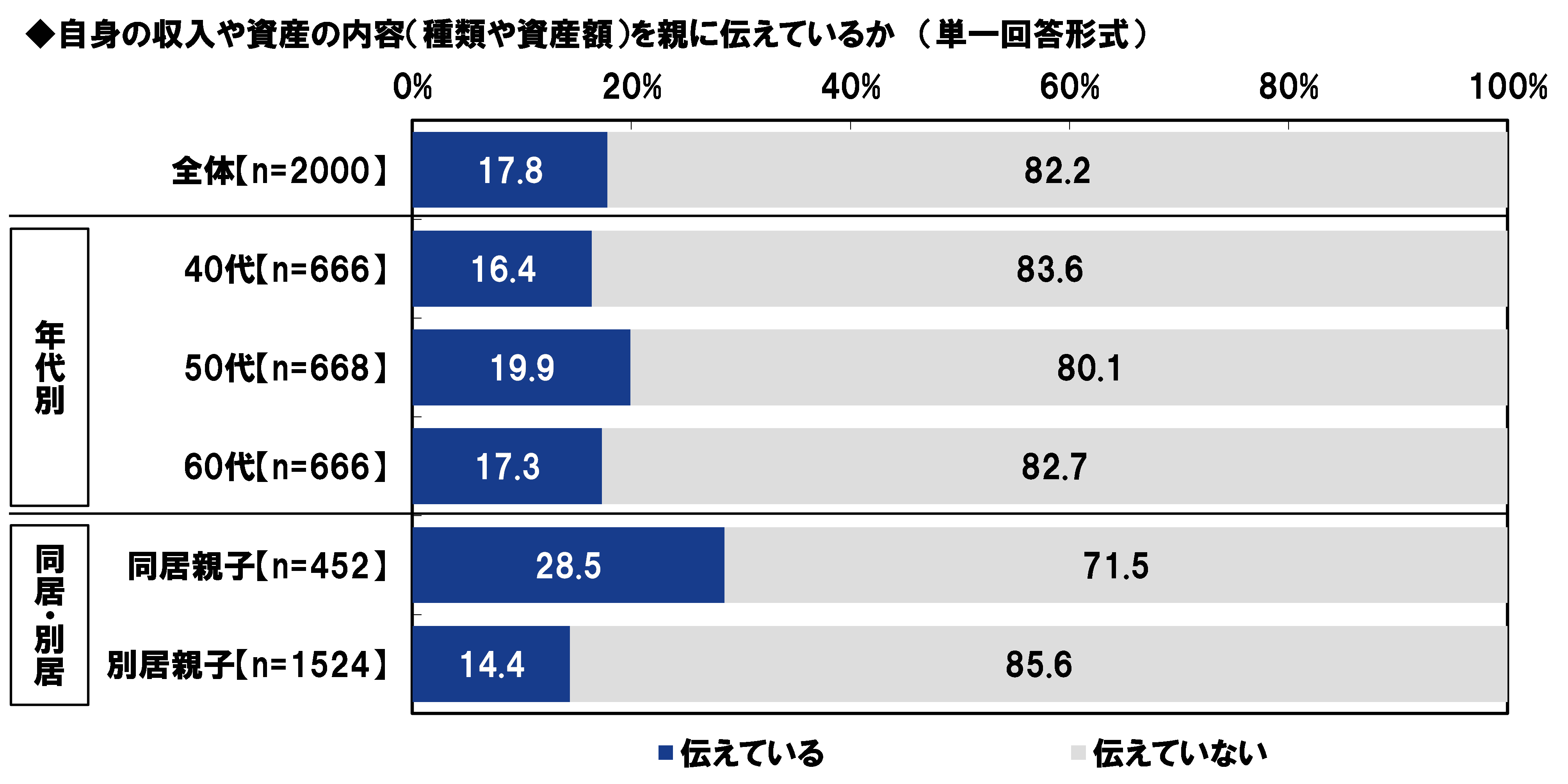 自身の収入や資産の内容(種類や資産額)を親に伝えているか聞いたところ、「伝えている」は17.8%、「伝えていない」は82.2%となり、大多数が伝えていないことがわかりました。