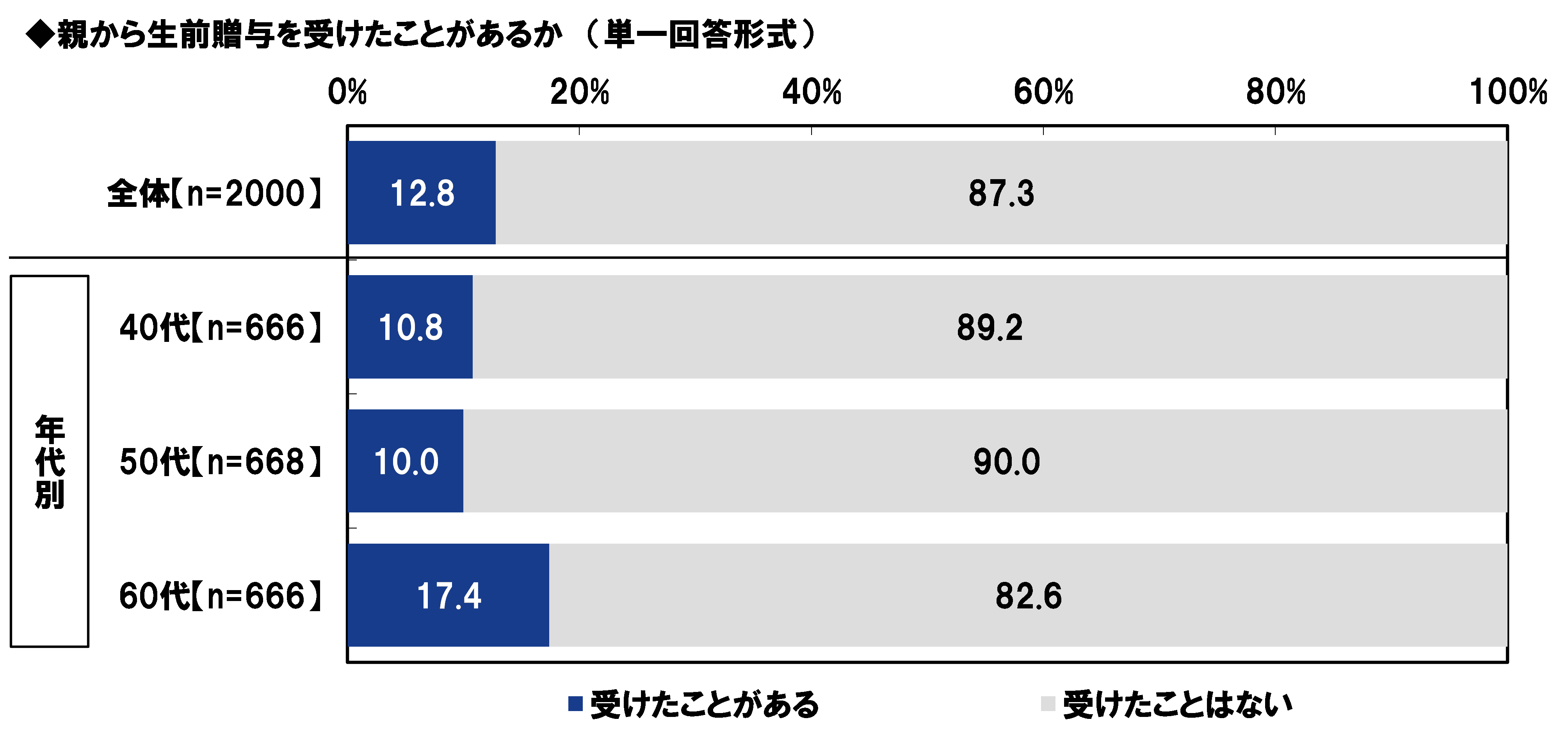 親から生前贈与を受けたことがあるかを聞いたところ、「受けたことがある」は12.8%、「受けたことはない」は87.3%となりました。