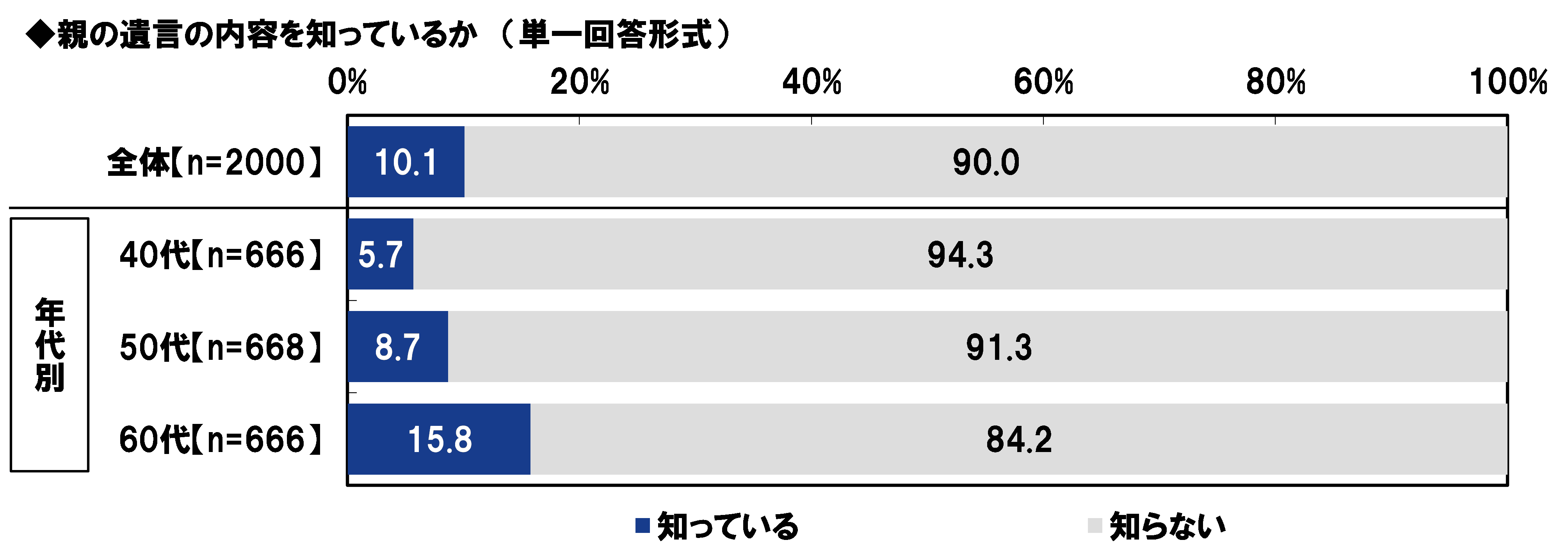 親の遺言の内容を知っているかを聞いたところ、「知っている」は10.1%、「知らない」は90.0%となりました。