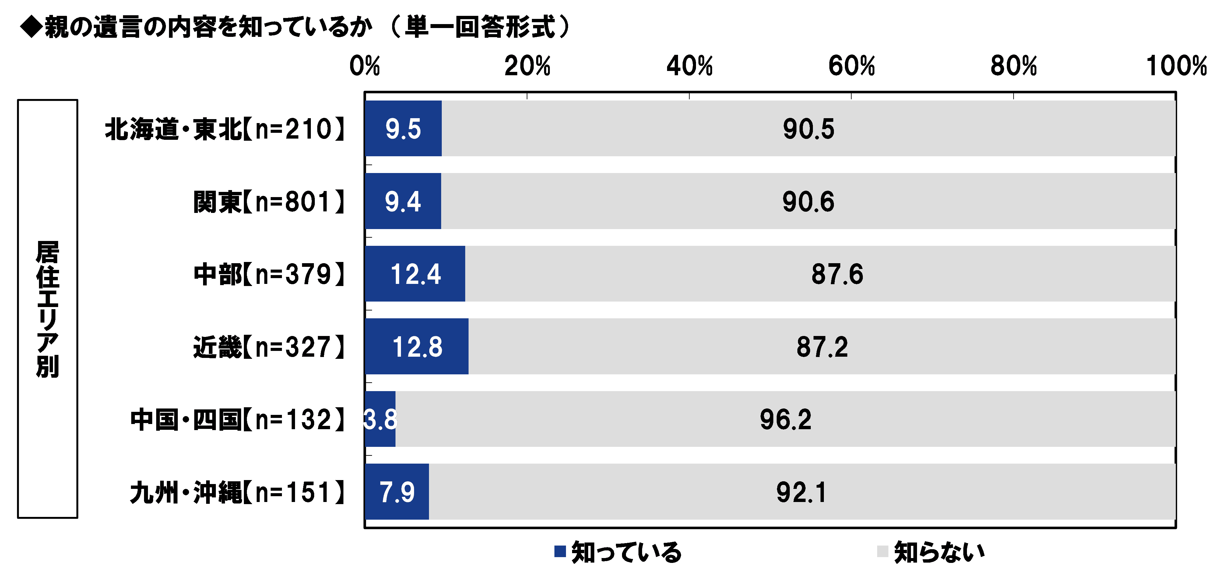 居住エリア別にみると、「知っている」は、相続対策を既にしている人と同様に、近畿(12.8%)が最も高くなり、中部(12.4%)が続きました。一方で、最も低くなったのは、中国・四国(3.8%)で、5%を下回りました。