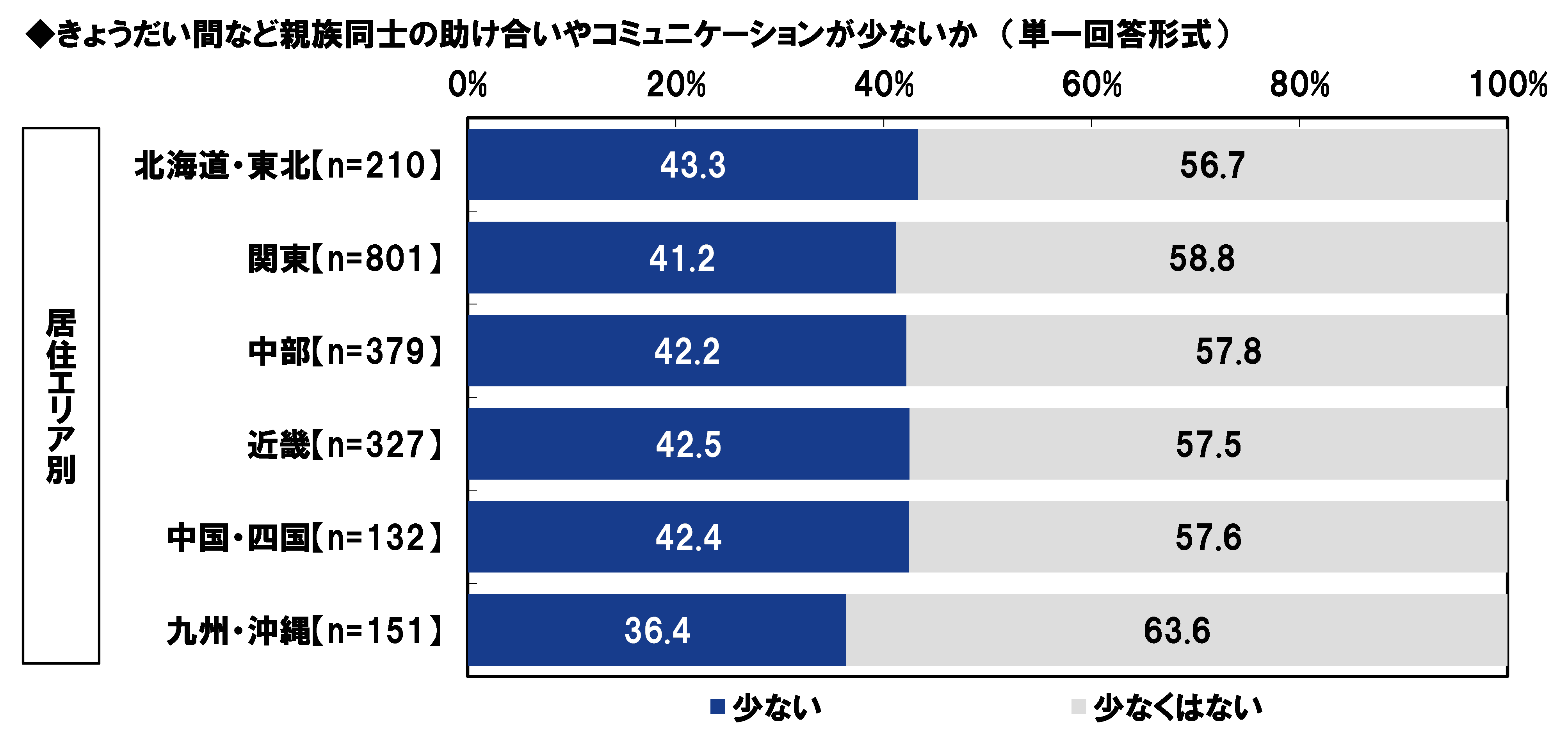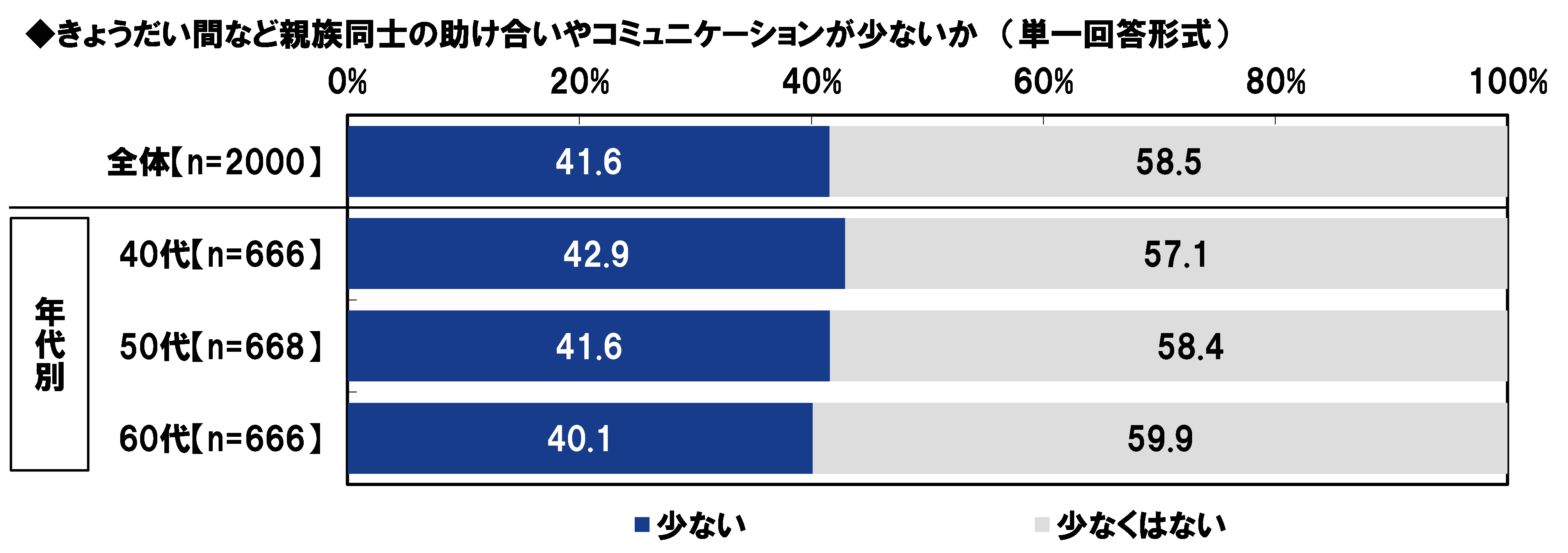 きょうだい間など親族同士の助け合いやコミュニケーションが少ないかを聞いたところ、「少ない」は41.6%、「少なくはない」は58.5%となりました。親族相互で声を掛け合ったり、協力したりする機会に乏しいと感じている人が少なくないようです。