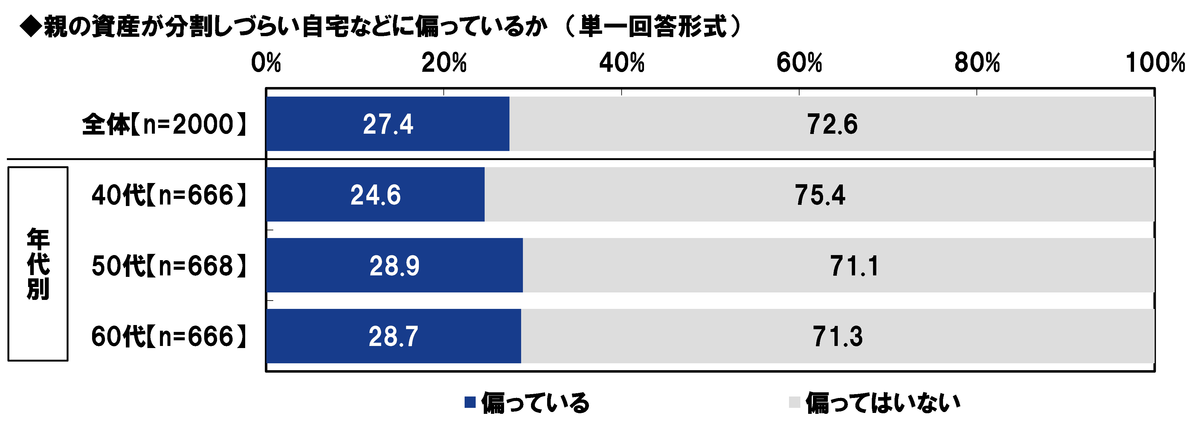 親の資産が分割しづらい自宅などに偏っているかを聞いたところ、「偏っている」は27.4%、「偏ってはいない」は72.6%となりました。
