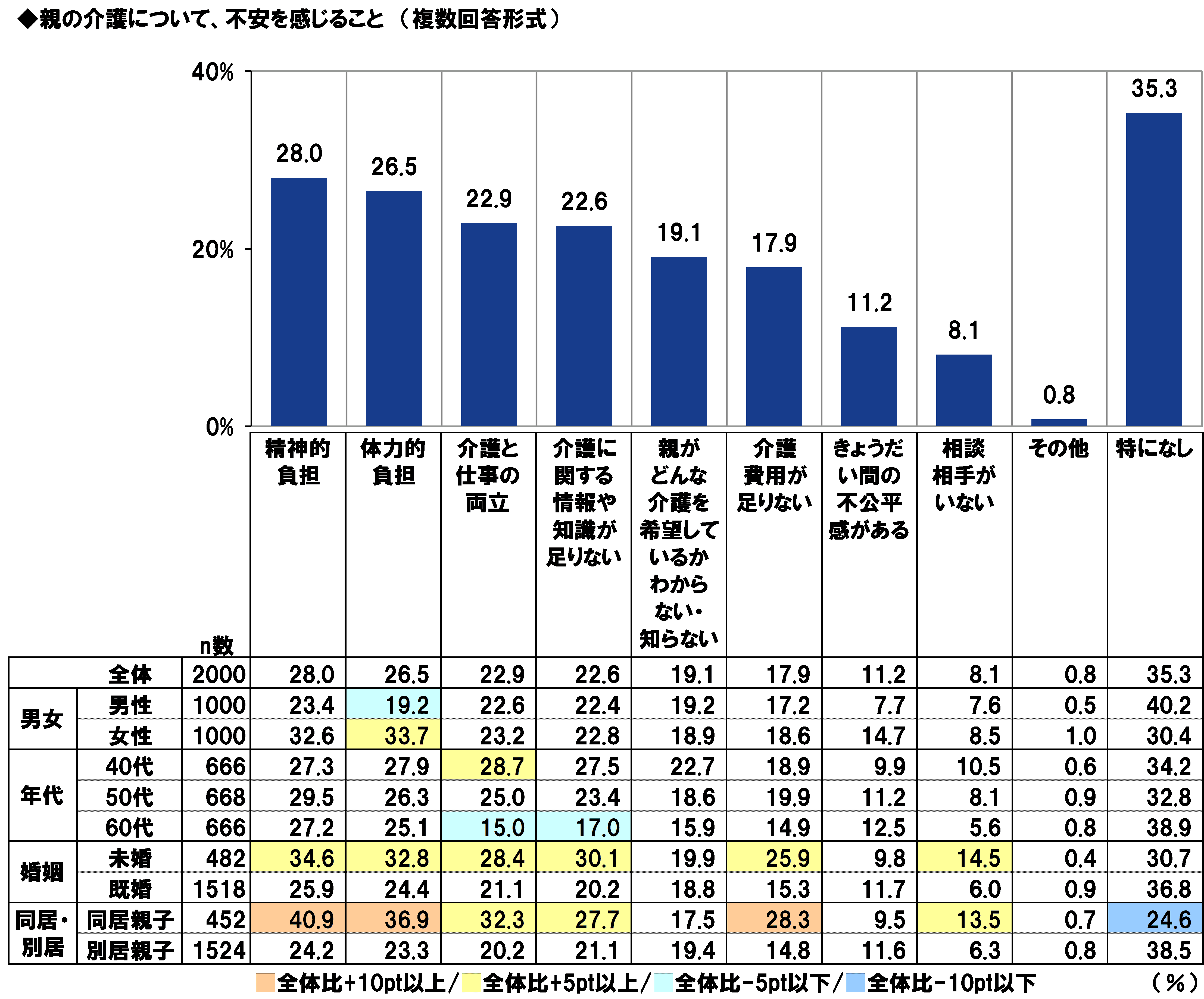 全回答者(2,000名)に、親の介護について、不安を感じることを聞いたところ、「精神的負担」(28.0%)が最も高くなり、「体力的負担」(26.5%)、「介護と仕事の両立」(22.9%)、「介護に関する情報や知識が足りない」(22.6%)、「親がどんな介護を希望しているかわからない・知らない」(19.1%)、「介護費用が足りない」(17.9%)が続きました。金銭面に対してよりも、心身への負担や仕事との両立、情報不足といったことに関して懸念している人のほうが多いようです。