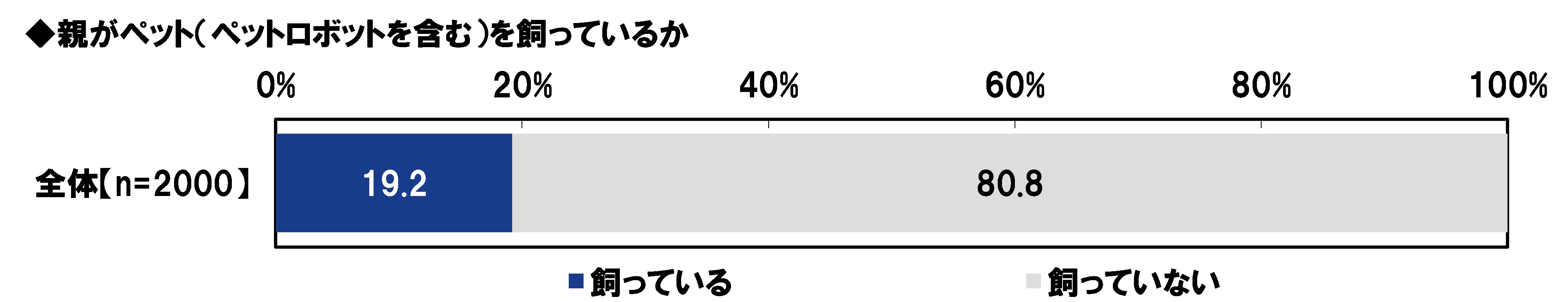 全回答者(2,000名)に、親がペット(ペットロボットを含む)を飼っているか聞いたところ、「飼っている」は19.2%、「飼っていない」は80.8%となりました。