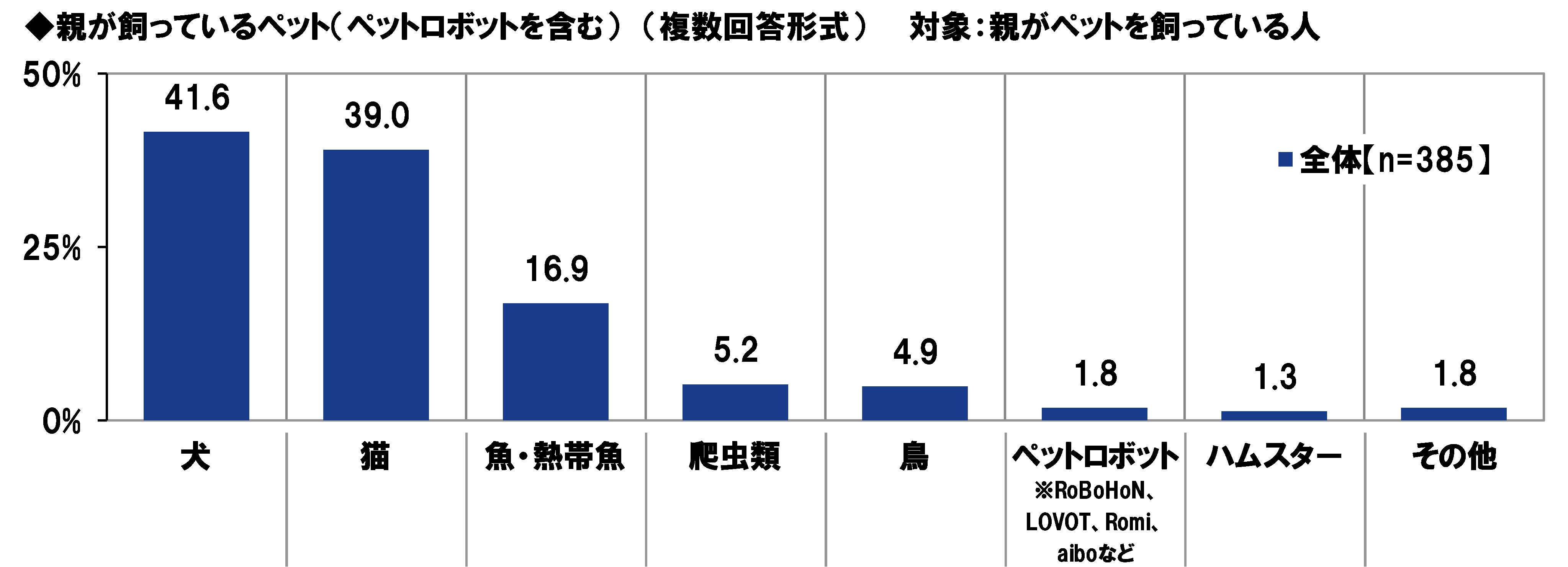 親がペットを飼っている人(385名)に、親が飼っているペットを聞いたところ、「犬」(41.6%)と「猫」(39.0%)が高くなり、「魚・熱帯魚」(16.9%)、「爬虫類」(5.2%)、「鳥」(4.9%)が続きました。