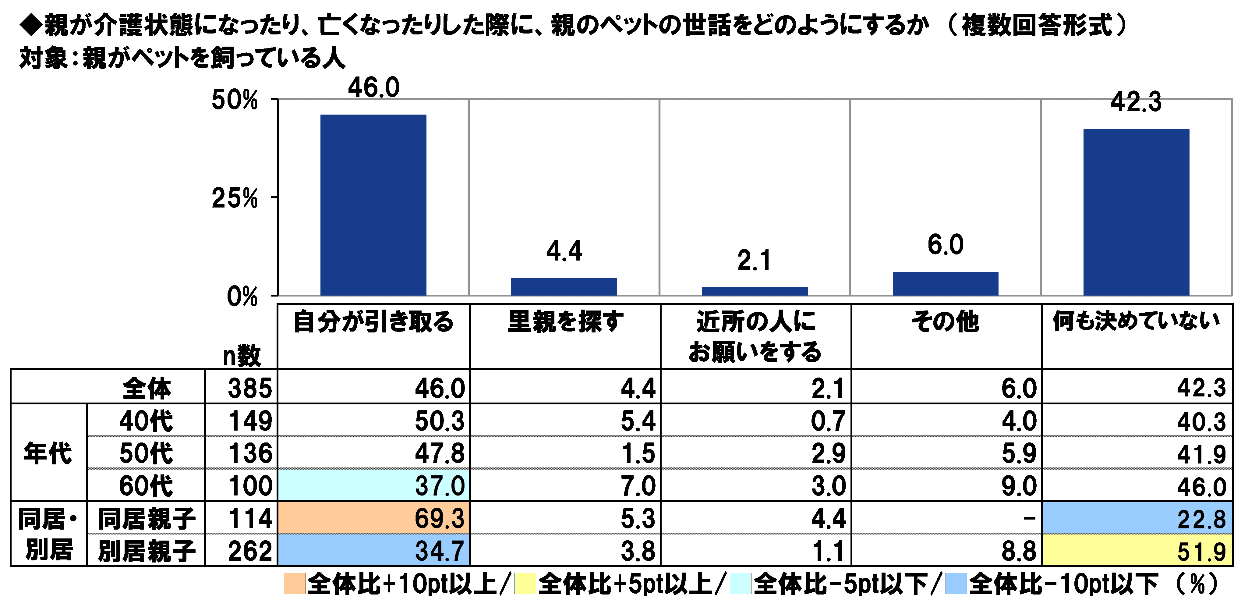 同居親子・別居親子についてみると、別居親子では「何も決めていない」(51.9%)が半数を超える結果となりました。親と別居している人の多くが、親がペットの世話をできなくなった際の問題について、検討を先送りにしている実状が明らかになりました。