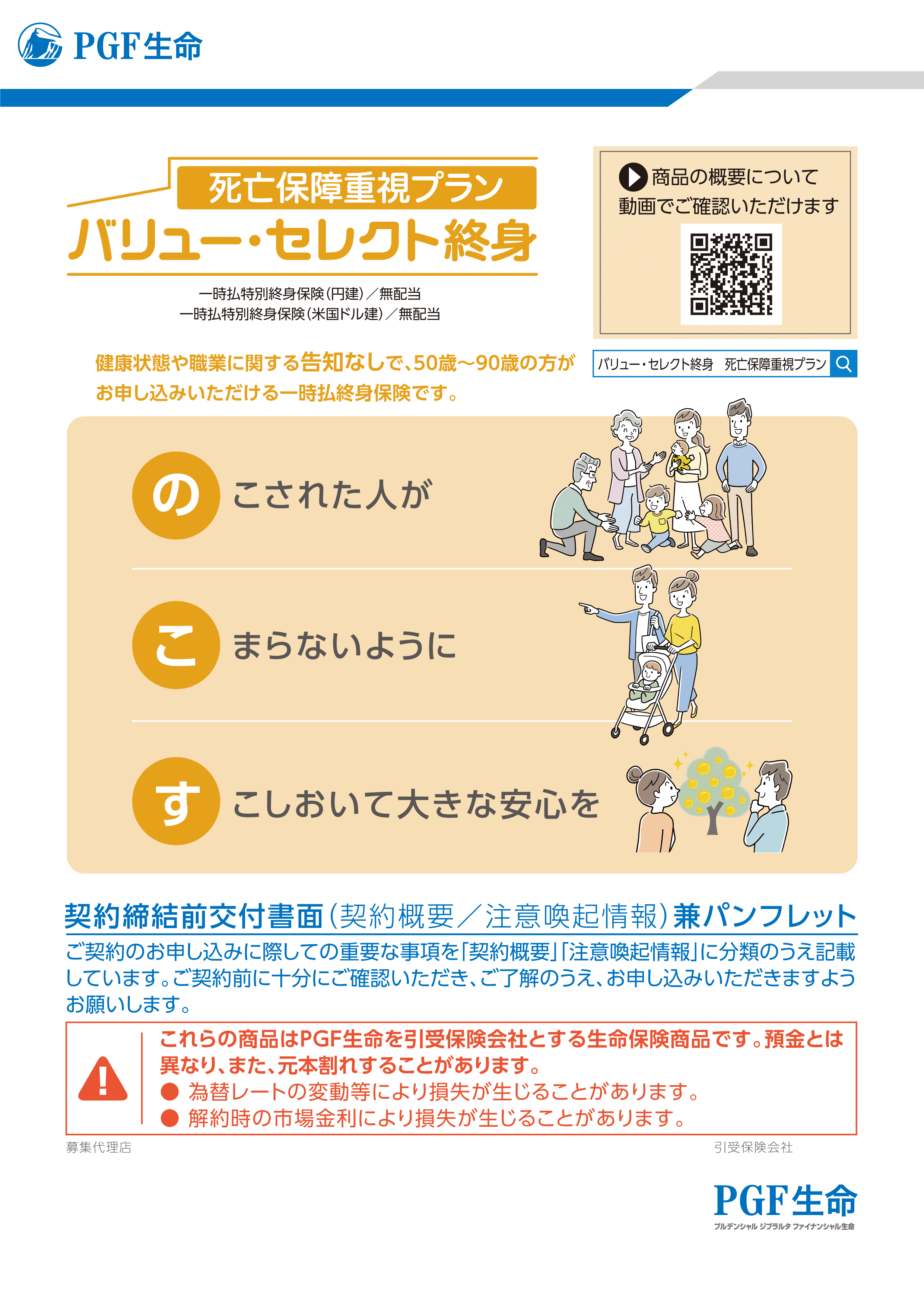 ・米ドルで保険金等をお受け取りいただく場合の手数料(PGF生命からご契約者または受取人の口座に送金するための送金手数料)をお受取額より差し引くことがあります(受取時にPGF生命にご確認ください)。